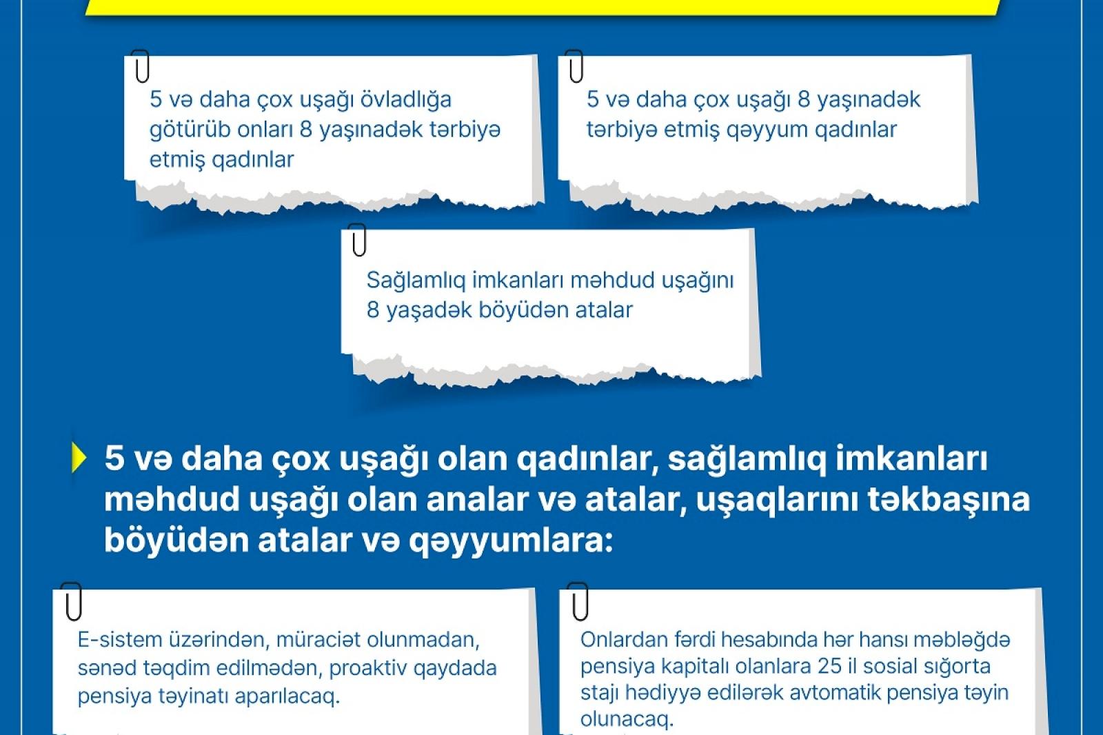 “Əmək pensiyaları haqqında” Qanuna digər bir yeni dəyişiklik isə erkən pensiya hüququ olan çoxuşaqlı (5 və daha çox uşağı olan) qadınlara, sağlamlıq imkanları məhdud uşağı olan analara və atalara, uşaqlarını təkbaşına böyüdən atalara və qəyyumlara münasibətdə humanist, güzəştli yanaşmanı nəzərdə tutur.