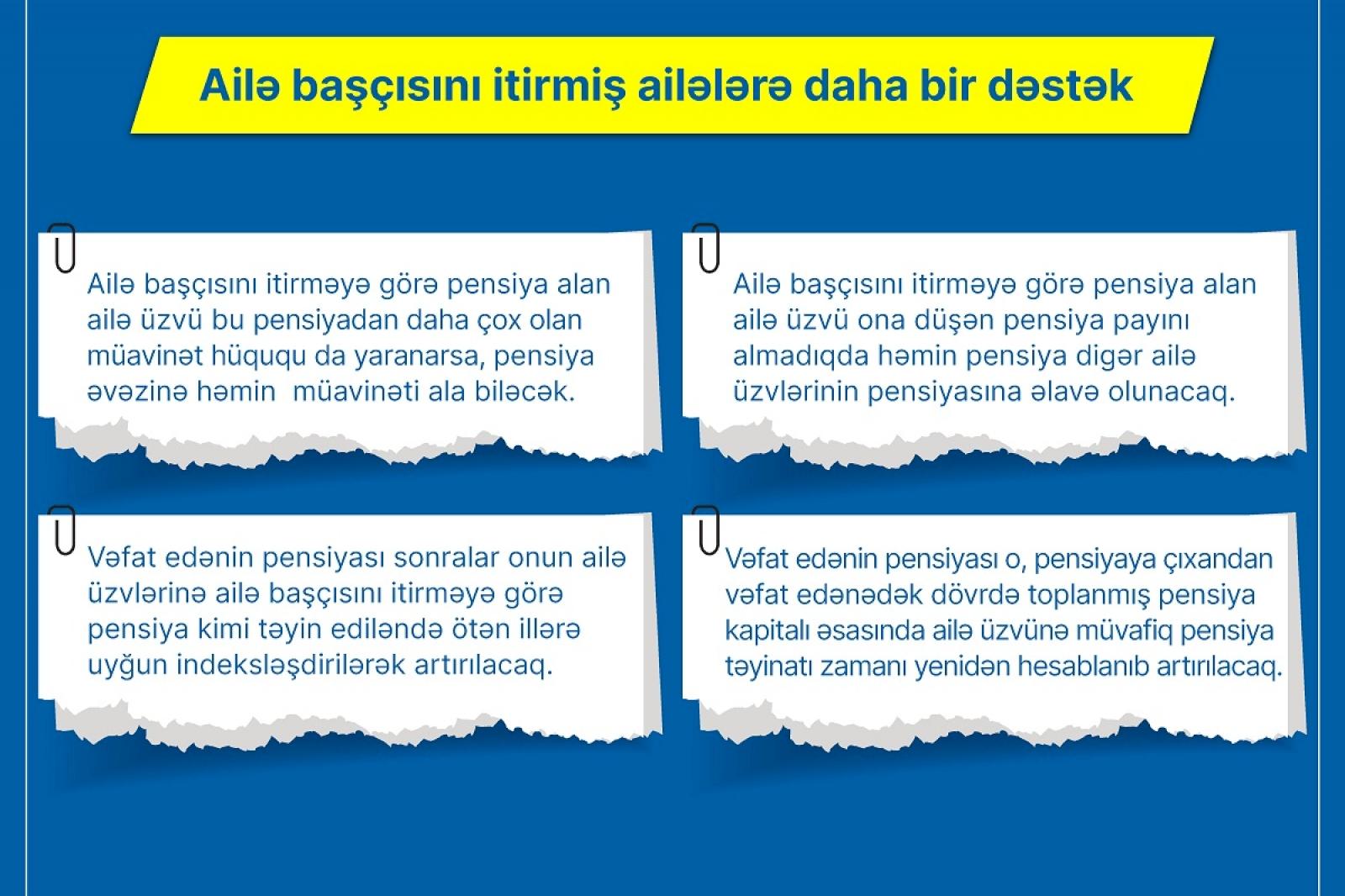 Vəfat edən şəxsin pensiya məbləği onun ailə üzvlərinə sonradan ailə başçısını itirməyə görə pensiya kimi təyin ediləndə ötən illərə uyğun şəkildə indeksasiya edilərək artırılacaq.