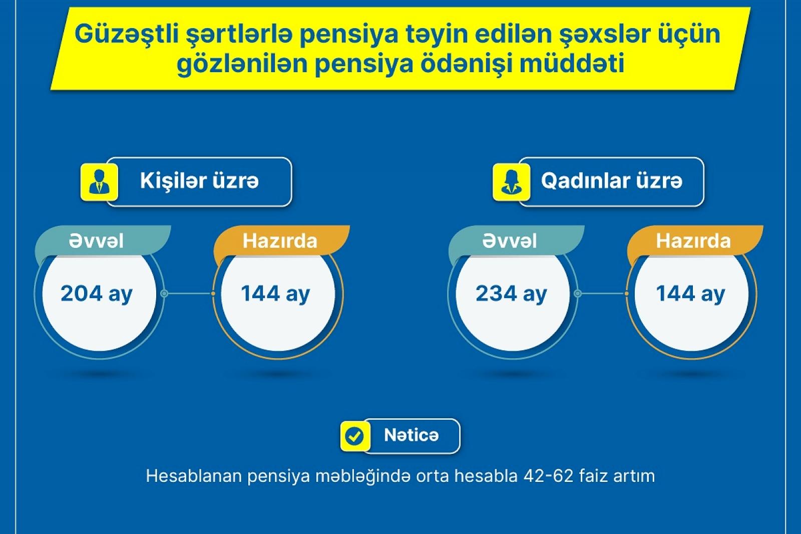 Digər tərəfdən, güzəştli şərtlərlə pensiya təyin edilən şəxslər üçün gözlənilən pensiya ödənişi müddəti də kişilər üzrə 204-dən, qadınlar üzrə 234-dən 144-ə endirilir. Bu da onlara hesablanan pensiya məbləğinin orta olaraq 42-62 faiz artması ilə nəticələnəcək.