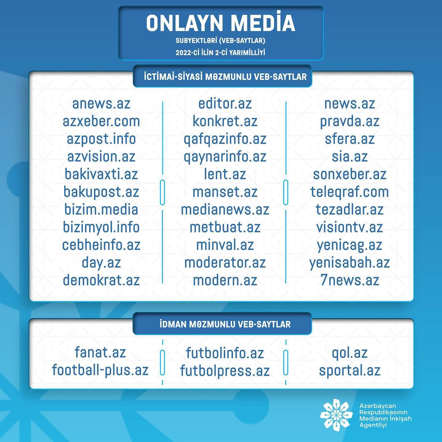 Azərbaycan Medianın İnkişafı Agentliyi onlayn media subyektlərinə (veb-saytlara) dəstək layihəsi çərçivəsində elan edilmiş müsabiqənin nəticələrini açıqlayıb.