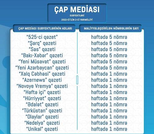 Qeyd edək ki, layihə çərçivəsində həftədə bir nömrəsi maliyyələşdirilən qəzetlərin hər birinə aylıq 5 000 manat, həftədə beş nömrəsi maliyyələşdirilən qəzetlərin hər birinə isə aylıq 15 000 manat məbləğində maliyyə yardımı göstərilir.