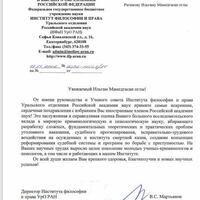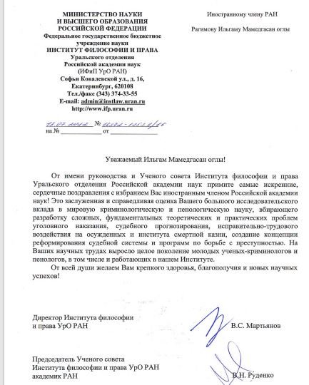 Təbrik məktubunu REA-nın Fəlsəfə və Hüquq İnstitutunun Ural bölməsinin direktoru V.S.Martınov və institutun elmi şurasının sədri V.N.Rudenko imzalayıblar.