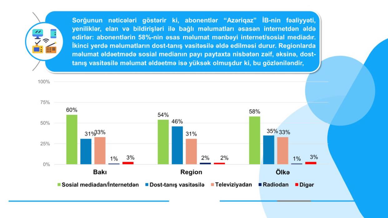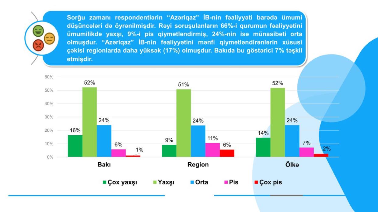 SOCAR "Azəriqaz" İstehsalat Birliyin “ASAN xidmət” və “ASAN Kommunal” mərkəzlərindəki xidmətləri, eləcə də Çağrı mərkəzinin və Qəza xidmətinin əməkdaşları barədə abonentlər arasında sorğu aparan “QBS Consulting” MMC son olaraq Birliyin ümumi fəaliyyəti, yenilikləri, elan və bildirişləri necə əldə etmələri ilə bağlı sorğu keçirib.