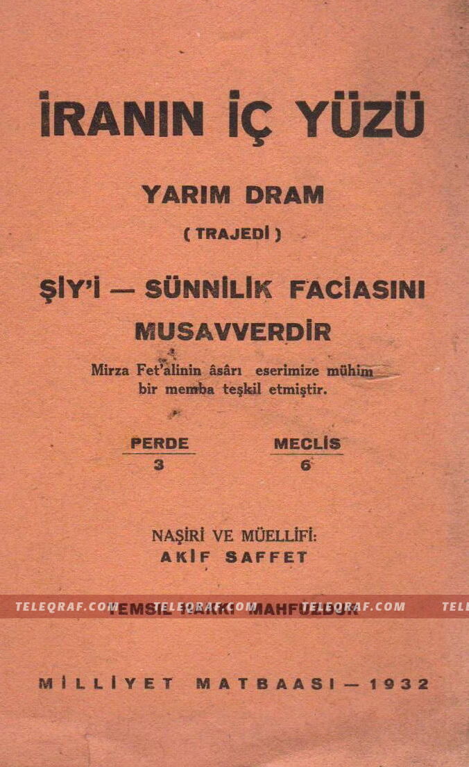 Akif Saffet (Akif Səfvət) adlı bu şəxsin bizə məlum olan iki kitabı var. Axundzadənin əsəri əsasında yazılmış kitabının üzərində bu şəkildə məlumat verilib: “İran'ın iç yüzü: Yarım dram (trajedi): Şiy'i - Sünnilik faciasını musavverdir. Mirza Fet'alinin asarı eserimize mühim bir memba teşkil etmiştir. Perde 3, Meclis 6. Naşiri ve müeelifi: Akif Saffet”.