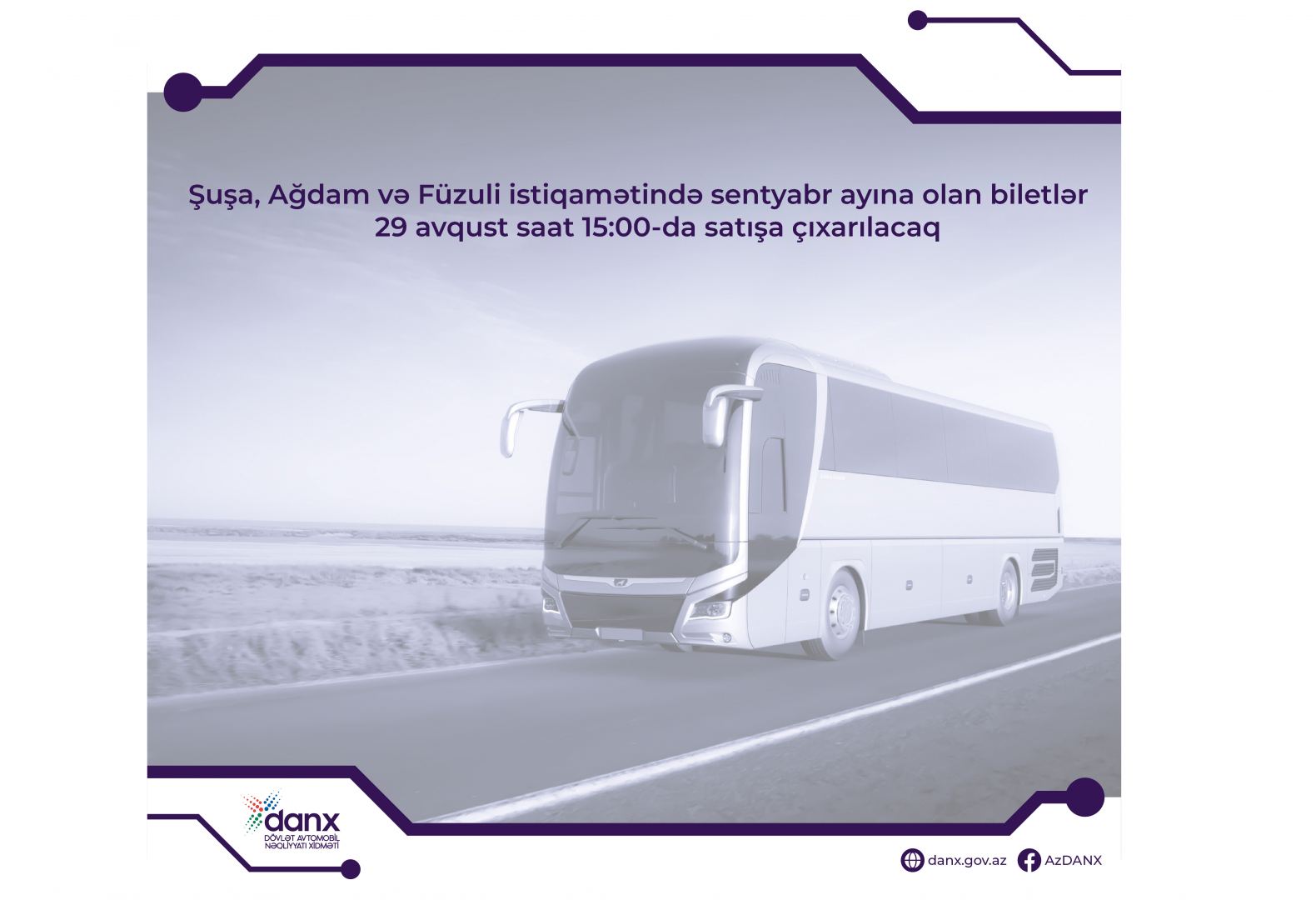 Şuşa, Ağdam və Füzuli şəhərlərinə təşkil olunan müntəzəm avtobus reyslərinə sentyabr ayına olan biletlər 29 avqust 2022-ci il saat 15:00-da satışa çıxarılacaq.