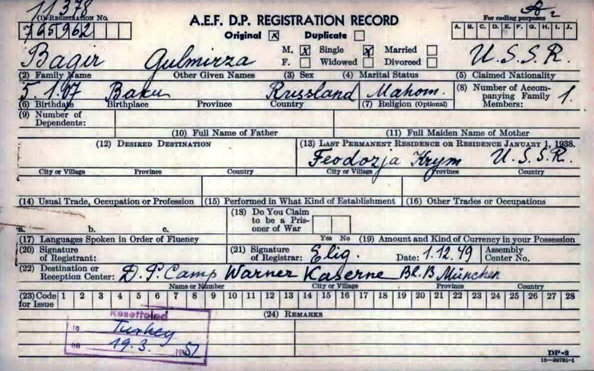 Arolsen arxivindəki 1949-cu ilə aid sənədlərə görə Gülmirzə Bağır 1907-ci il yanvar ayının 5-də Bakıda doğulub. Krımda – Feodosiyada əsir düşüb. Evlidir, İslam dininə mənsubdur. Müharibədən sonra D.P. düşərgəsində yaşayıb. Atasının adı Mustafa, anasının adı Səriyyə olub. Dülgərdir. Rus, türk, alman dillərini bilir.
