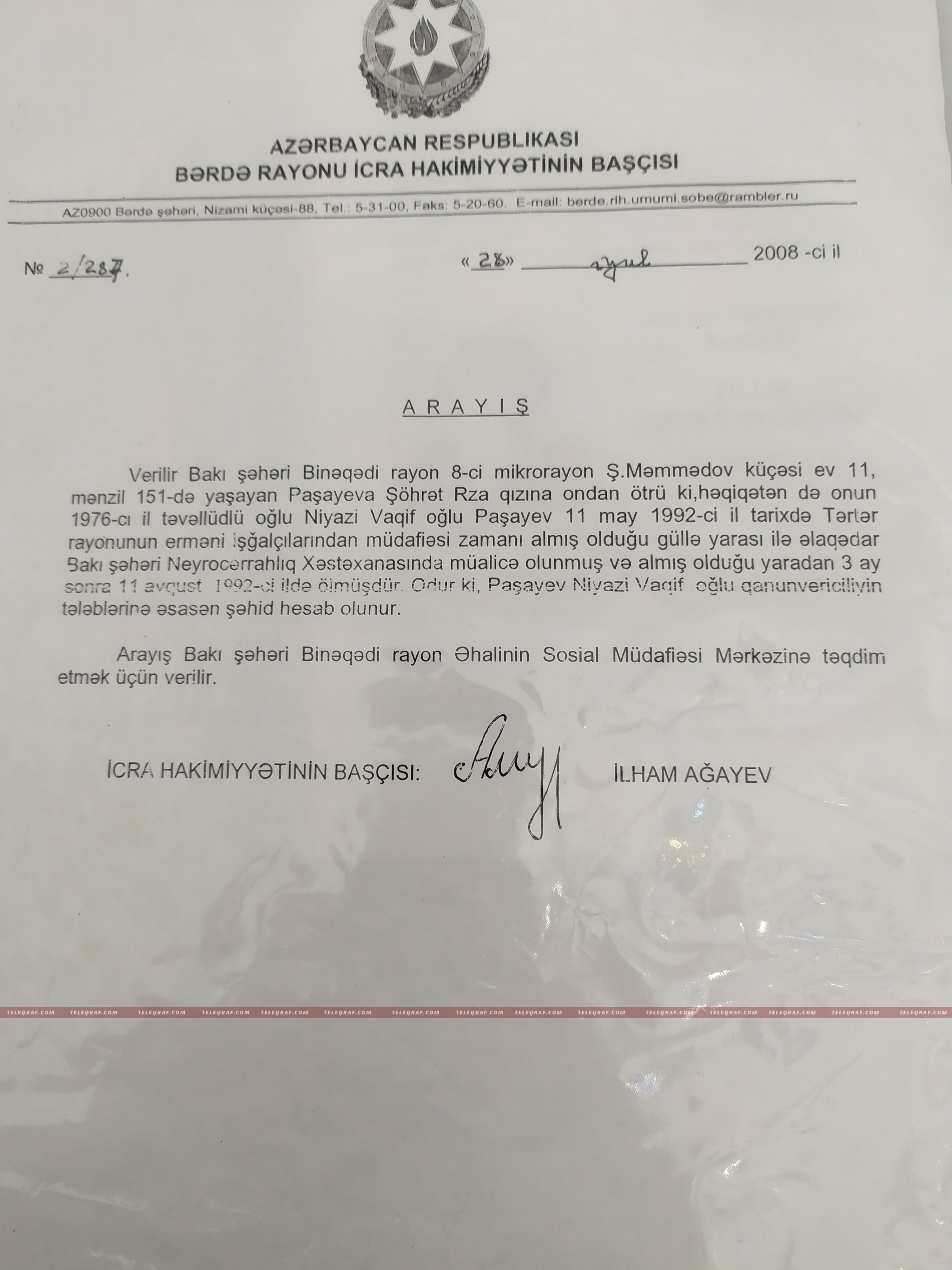 Sonradan bildim ki, Niyazi Səfərbərlik və Hərbi Xidmətə Çağırış üzrə Dövlət Xidmətinin Bərdə rayon şöbəsinin uçotunda olmayıb. Buna görə Bərdədə çox əsəbləşdirdilər məni. Halbuki onların kitablarında Niyazinin adı, ölüm səbəbi haqda məlumatlar var. Səfərbərlik xidməti deyir ki, Niyazi Paşayevin hərbi xidmət keçməsi barədə məlumat onlarda yoxdur. Axı, bu uşağın adı məktəbdə var, 9-cu sinifdən çağırışçı kimi Səfərbərlik Xidməti də qeydiyyata almalı idi. Bir şəhid anası kimi bu məsələ məni incidir, amma nə edim?! Onlar sanki uşağı tanımırmış kimi danışırdılar.