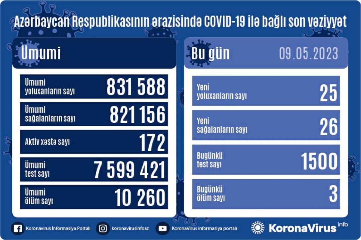 Mayın 9-da Azərbaycanda koronavirus (COVID-19) infeksiyasına 25 yeni yoluxma qeydə alınıb, 26 nəfər müalicə olunaraq sağalıb.