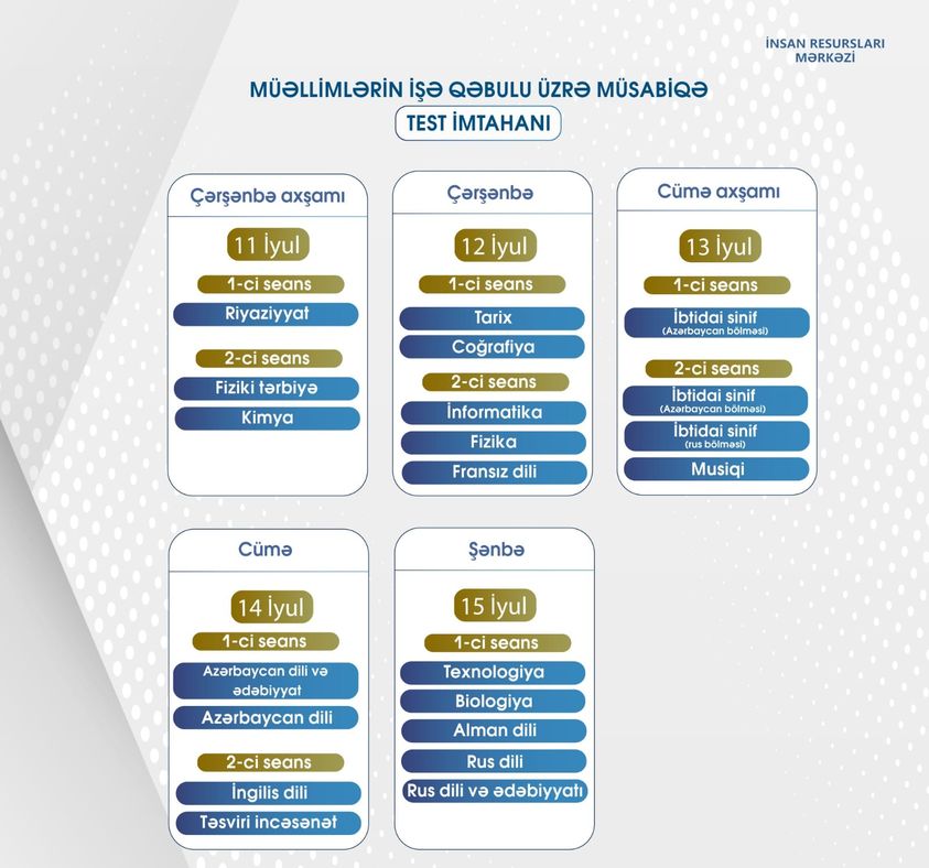 2023-2024-cü tədris ili üçün müəllimlərin işə qəbulu üzrə müsabiqənin test imtahanlarının vaxtı açıqlanıb.