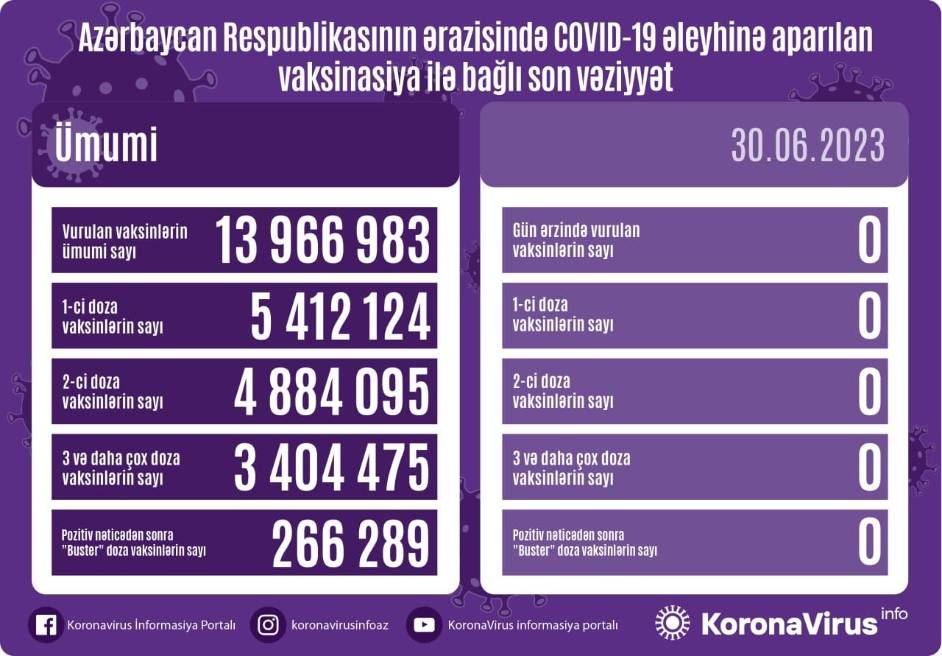 Bildirilib ki, vurulan vaksinlərin ümumi sayı 13 966 983, birinci mərhələ üzrə vaksinasiya olunanların ümumi sayı 5 412 124, ikinci mərhələ üzrə vaksinasiya olunanların sayı 4 884 095, üç və daha çox doza üzrə vaksinasiya olunanların sayı 3 404 475 təşkil edir.