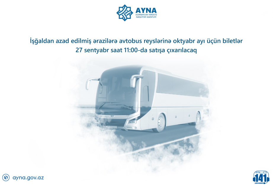 Rəqəmsal İnkişaf və Nəqliyyat Nazirliyinin tabeliyindəki Azərbaycan Yerüstü Nəqliyyat Agentliyinin (AYNA) işğaldan azad olunmuş ərazilərə təşkil etdiyi müntəzəm avtobus reyslərinə oktyabr ayı üçün biletlər sentyabrın 27-də saat 11:00-da satışa çıxarılacaq.