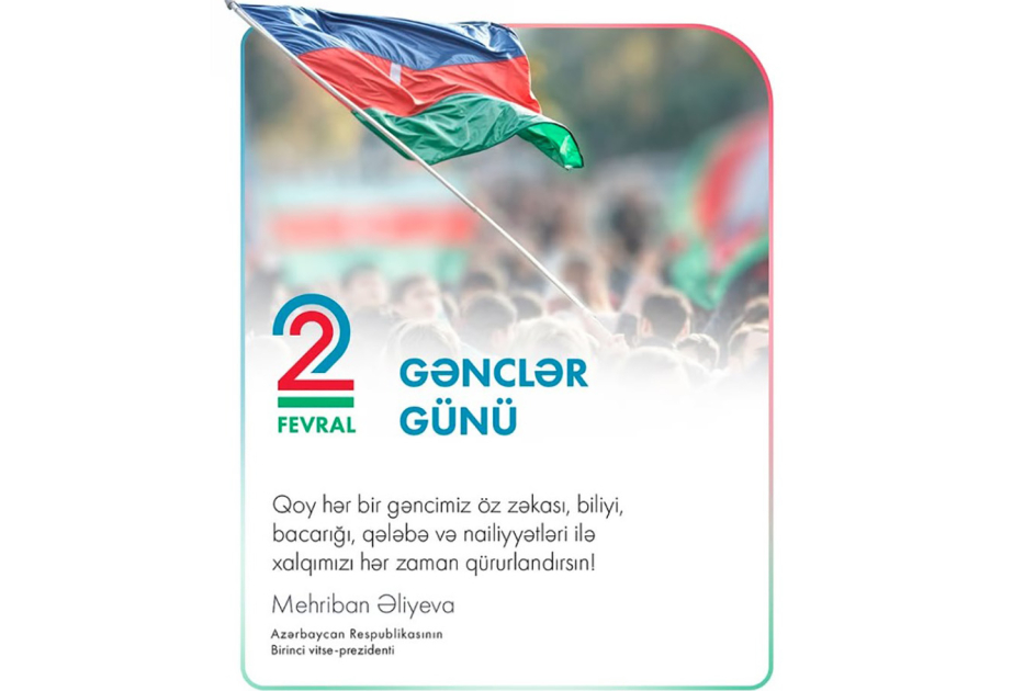 Birinci vitse-prezident Mehriban Əliyeva sosial şəbəkə hesabında 2 Fevral - Azərbaycan Gəncləri Günü münasibətilə paylaşım edib.