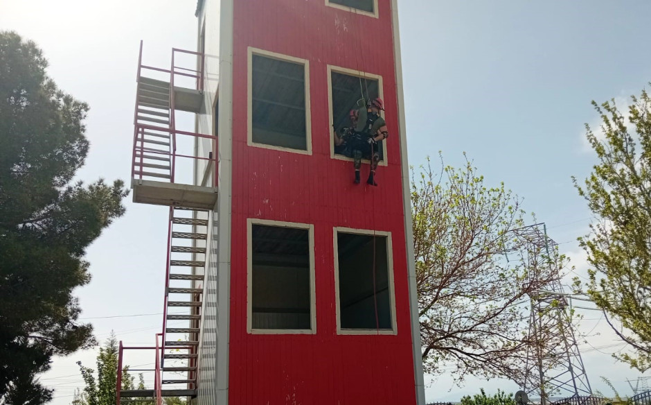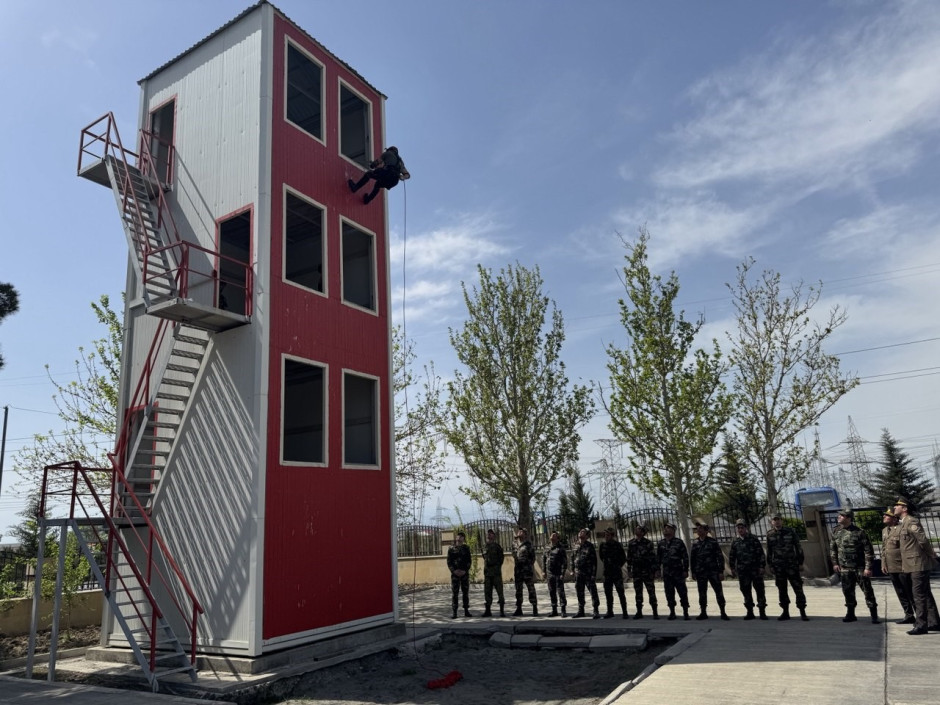 Təlim zamanı şərti olaraq hündürmərtəbəli binada yanğın nəticəsində vətəndaşın köməksiz vəziyyətdə qalması ilə əlaqədar yanğın-xilasetmə əməliyyatı simulyasiya edilib.