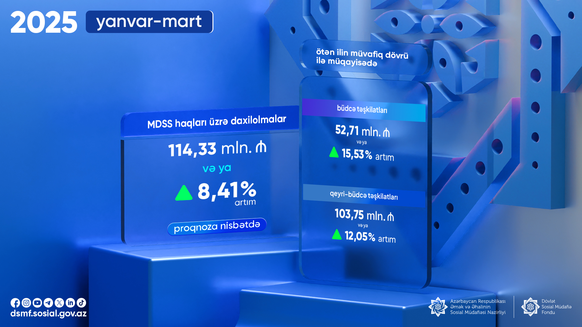 2025-ci ilin yanvar-mart ayları ərzində məcburi dövlət sosial sığorta haqları üzrə daxilolmalarda proqnoza nisbətdə 114,33 mln. manat və ya 8,41% artım qeydə alınıb.