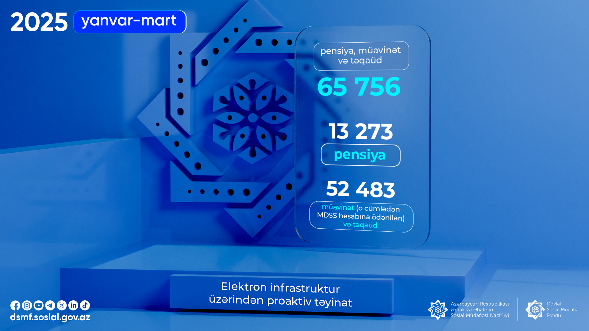 Bu ilin yanvar-mart ayları ərzində 65 756 pensiya, müavinət və təqaüd təyinatı elektron infrastruktur üzərindən proaktiv qaydada həyata keçirilib.
