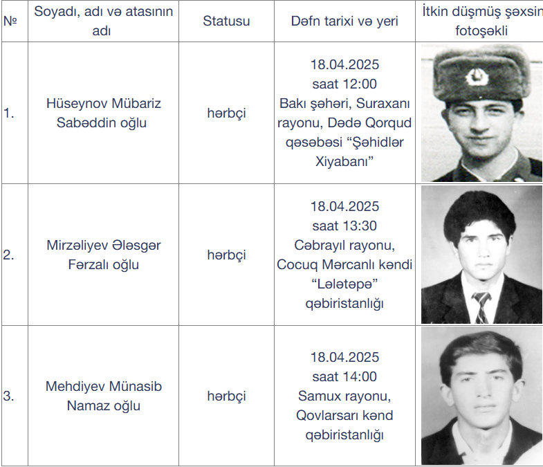 Şəhidlər aprelin 18-də dəfn olunacaq. M.Hüseynov Bakı şəhəri, Suraxanı rayonu, Dədə Qorqud qəsəbəsi “Şəhidlər Xiyabanı”nda, Ə.Mirzəliyev Cəbrayıl rayonu, Cocuq Mərcanlı kəndi, “Lələtəpə” qəbiristanlığında, M.Mehdiyev isə Samux rayonu, Qovlarsarı kənd qəbiristanlığında torpağa tapşırılacaq.
