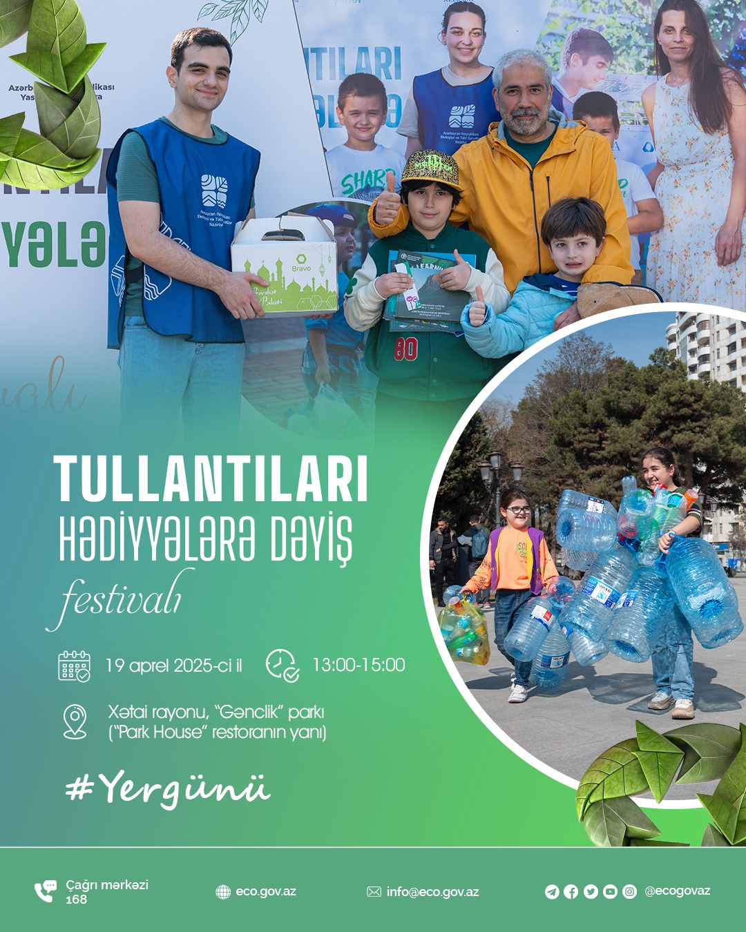 Ekologiya və Təbii Sərvətlər Nazirliyinin təşkilatçılığı, Xətai Rayon İcra Hakimiyyətinin və tərəfdaş qurumların dəstəyi ilə 19 aprel 2025-ci il tarixində saat 13:00-dan 15:00-dək Xətai rayonu, “Gənclik” parkında “Tullantıları hədiyyələrə dəyiş” festivalı keçiriləcək.