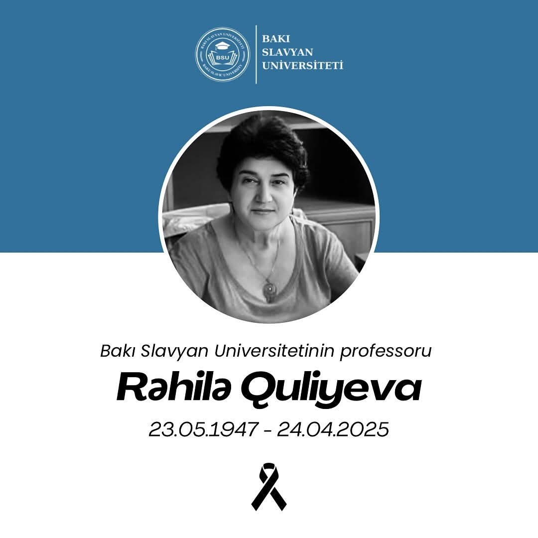 Bakı Slavyan Universitetinin nəzdində fəaliyyət göstərən Dissertasiya şurasının sədri, Ədəbiyyat nəzəriyyəsi kafedrasının professoru, filologiya elmləri doktoru, pedaqoq Rəhilə Hüseyn qızı Quliyeva dünyasını dəyişib.