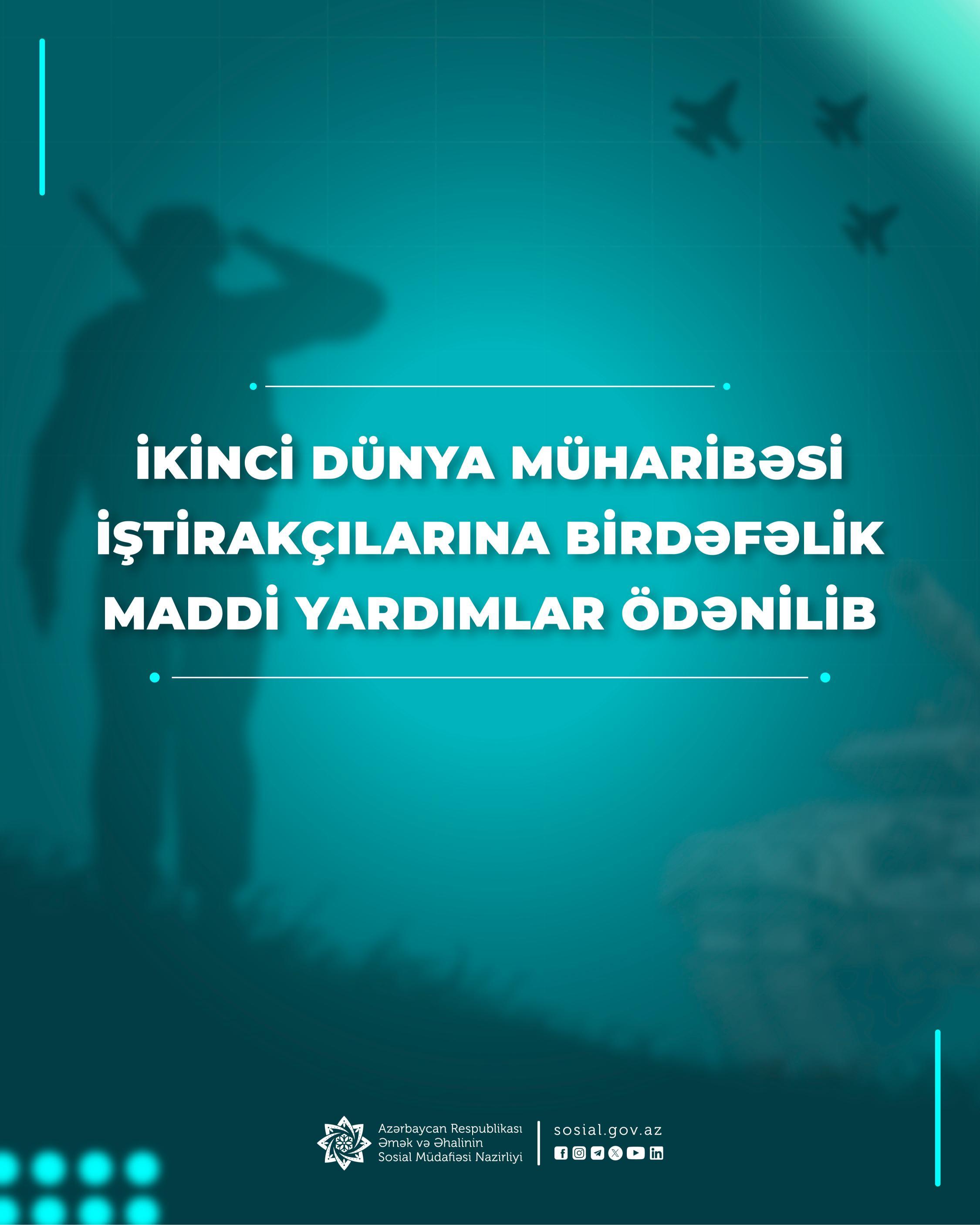 Prezident İlham Əliyevin 21 aprel 2025-ci il tarixli Sərəncamına əsasən, 1941–1945-ci illər İkinci Dünya müharibəsi iştirakçılarına və Sərəncamda nəzərdə tutulan digər şəxslərə birdəfəlik maddi yardımların ödənişi həyata keçirilib.