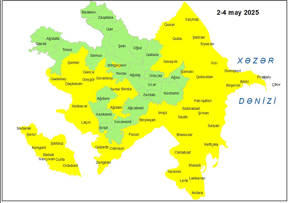Mayın 2-4-də Bakıda və Abşeron yarımadasında, eyni zamanda bəzi bölgələrdə gözlənilən küləkli hava şəraiti ilə bağlı sarı xəbərdarlıq verilib.