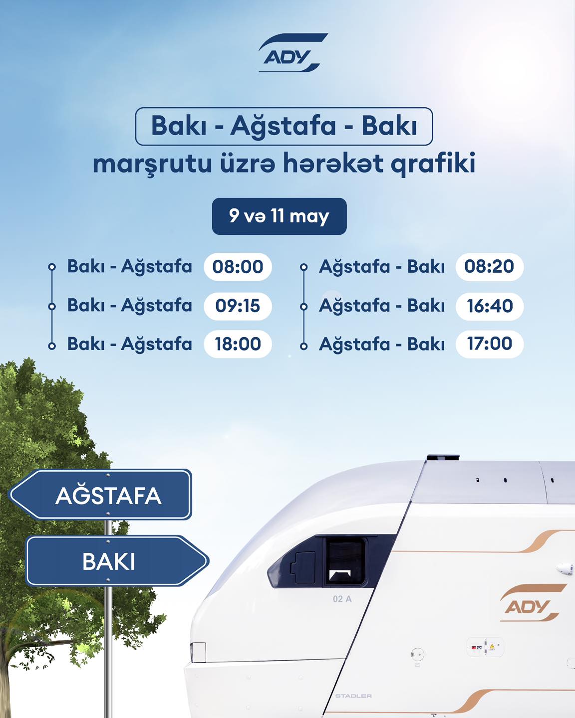 "Azərbaycan Dəmir Yolları" QSC Bakı-Ağstafa-Bakı marşrutuna artan sərnişin tələbatını təmin etmək məqsədilə bu xətt üzrə mayın 9-dan 11-dək əlavə qatar reysləri təyin edir.