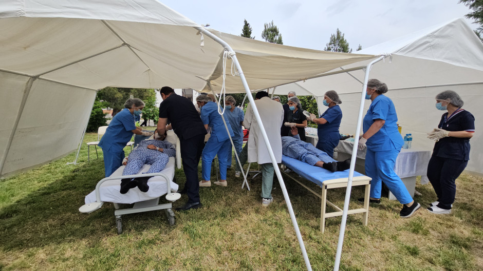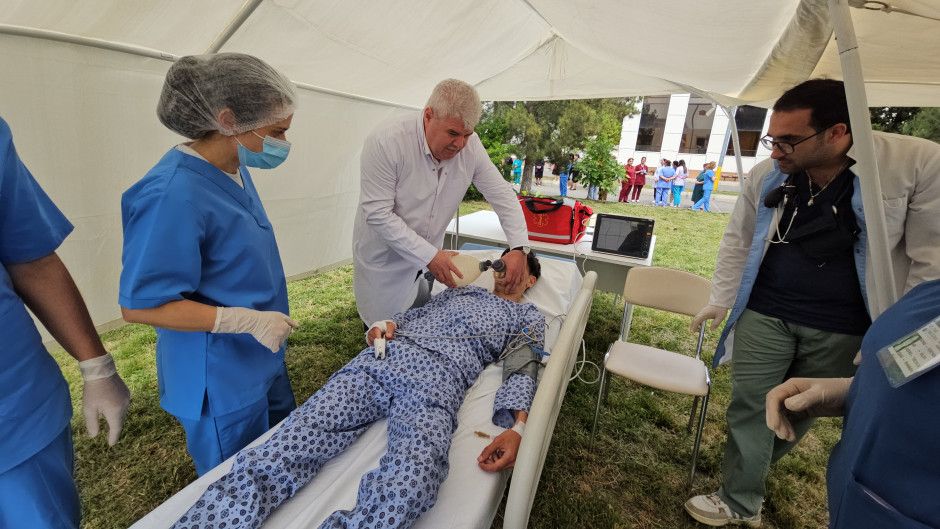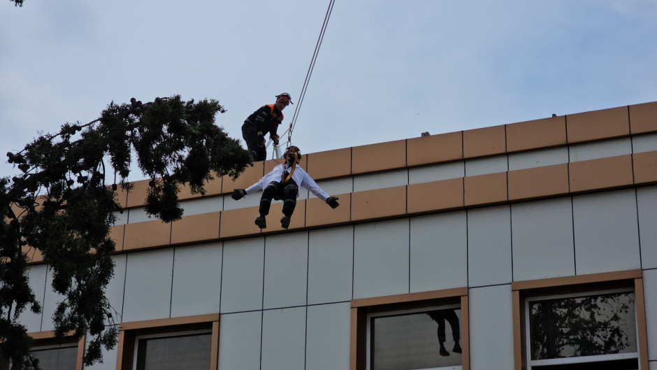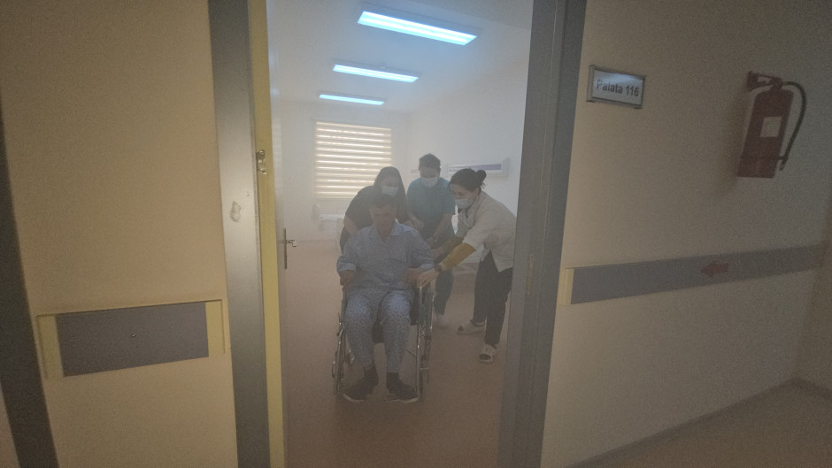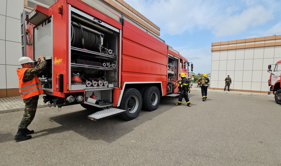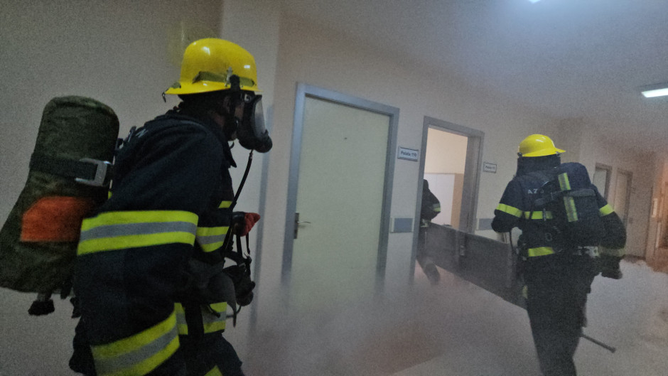 Sonra təlimin praktiki hissəsinə start verilib. Belə ki, şərti yanğın zamanı “Həyəcan” siqnalı verildikdən sonra FHN-in yanğın-xilasetmə bölmələri operativ qaydada hadisə yerinə çataraq xəstəxananın müvafiq personalı ilə əlaqəli şəkildə obyektin təxliyə planına uyğun insanların təhlükəsiz yerə təxliyəsini həyata keçirib, paralel olaraq “yanğınla mübarizə” tədbirləri yerinə yetirilib, habelə şərti xəsarət almış şəxslərə “ilkin yardım göstərilib”.