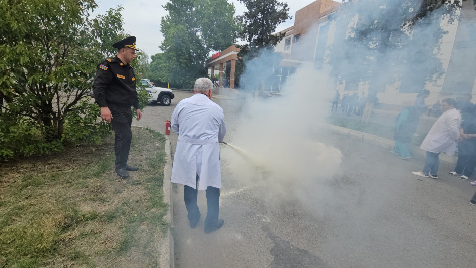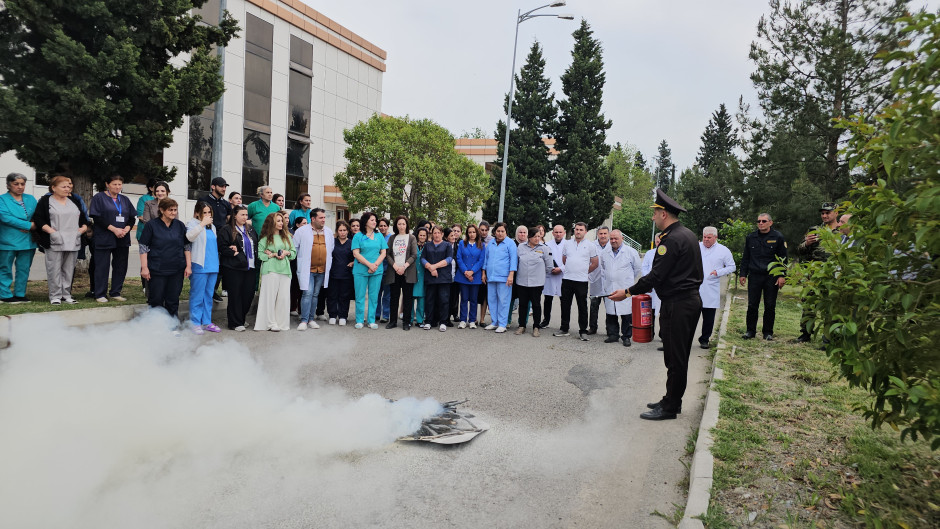 Əvvəlcə, təlimin nəzəri hissəsində FHN-in əməkdaşları tərəfindən xəstəxananın kollektivinə fövqəladə hallar, o cümlədən yanğınlar zamanı zəruri davranış qaydaları, təxliyə tədbirləri barədə ətraflı məlumat verilib, bu barədə videoçarxlar nümayiş etdirilib.