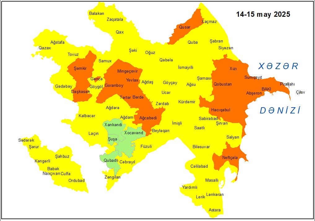 Mayın 14-dən 15-i gündüzədək Bakıda və Abşeron yarımadasında, eyni zamanda bəzi bölgələrdə gözlənilən küləkli hava şəraiti ilə bağlı sarı və narıncı xəbərdarlıq verilib.