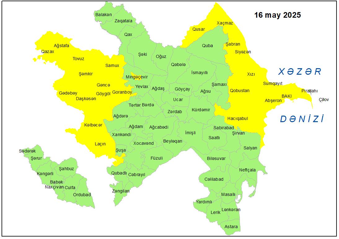 Mayın 16-da Bakıda və Abşeron yarımadasında, eyni zamanda bəzi bölgələrdə gözlənilən küləkli hava şəraiti ilə bağlı sarı xəbərdarlıq verilib.