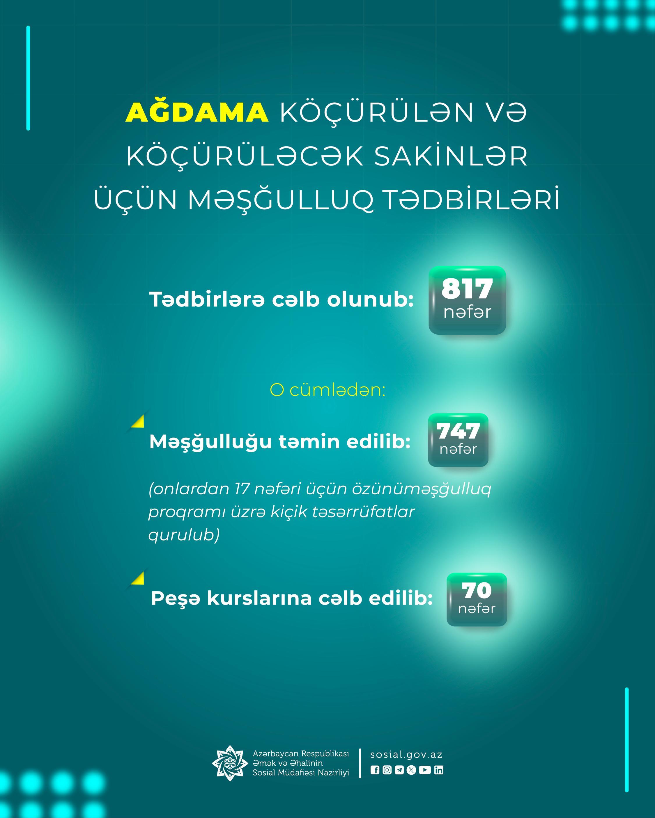 Onlardan 747 şəxsin rayon ərazisində məşğulluğu təmin edilib (o cümlədən rayona köçürülən sakinlərdən 17 şəxs üçün özünüməşğulluq proqramı üzrə kiçik təsərrüfatlar yaradılıb), 70 sakin isə peşə kurslarına cəlb edilib.