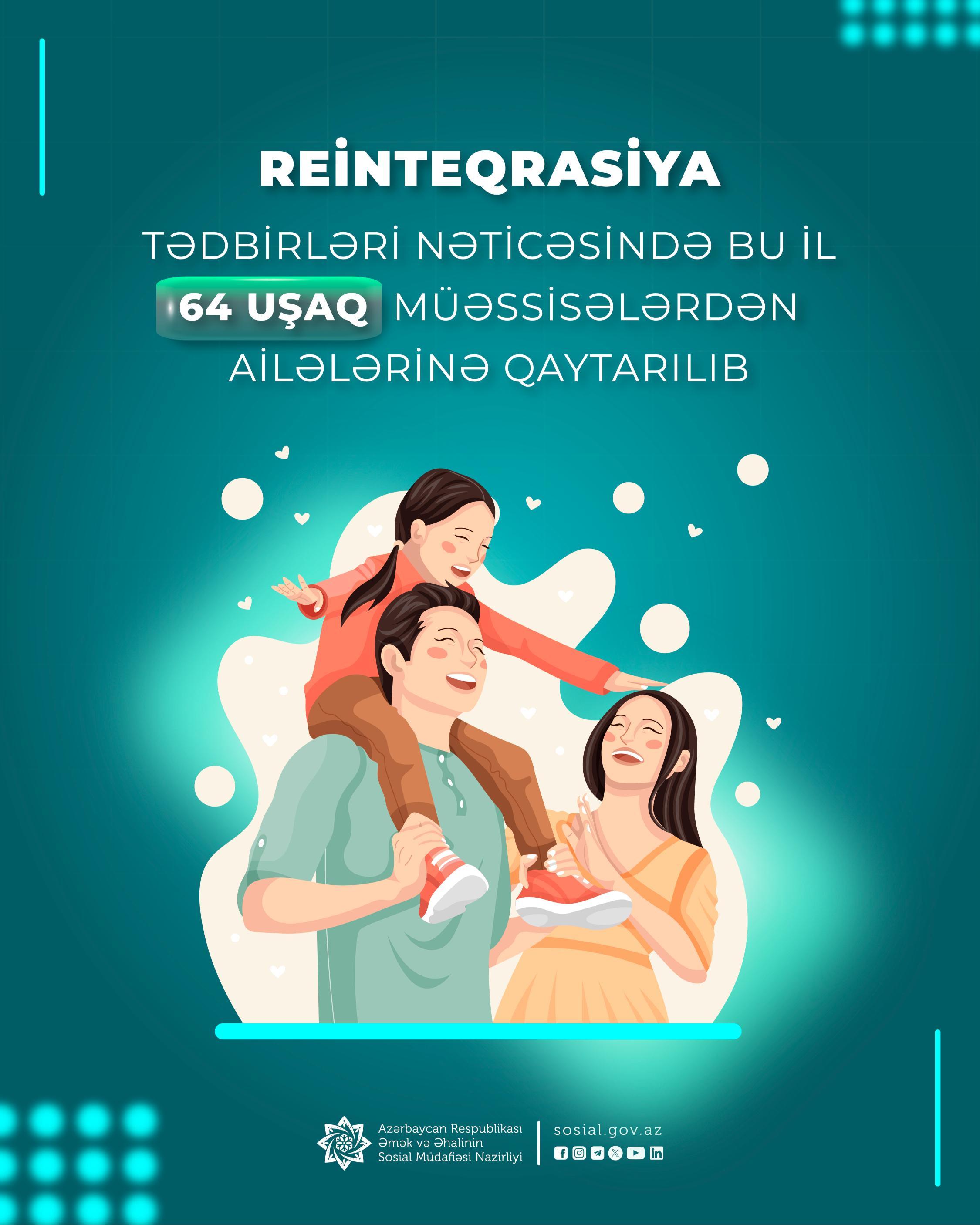 Əmək və Əhalinin Sosial Müdafiəsi Nazirliyinin tabeliyində Sosial Xidmətlər Agentliyinin reinteqrasiya tədbirləri nəticəsində bu il daha 64 uşağın müəssisələrdən ailələrinə qayıdışına nail olunub.