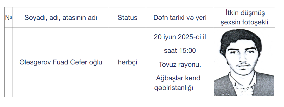 Hərbçi olmuş Ələsgərov Fuad Cəfər oğlu iyunun 20-i, saat 15:00-da Tovuz rayonu, Ağbaşlar kənd qəbiristanlığında dəfn olunacaq.
