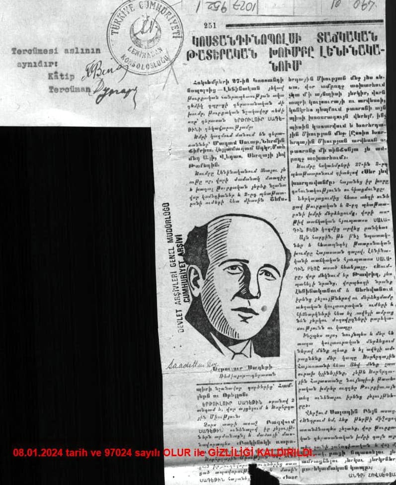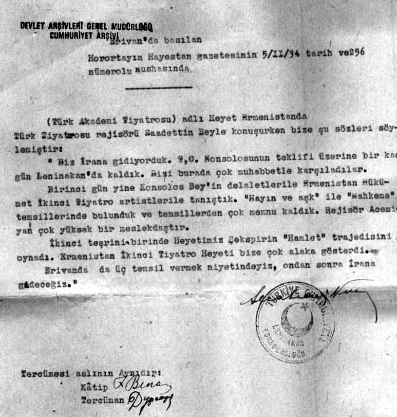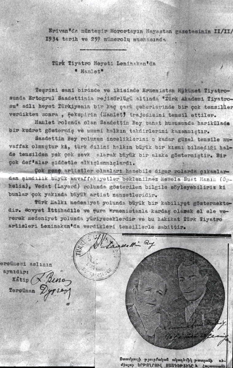 17 dekabr 1934-cü ildə göndərilmiş raportun girişində yazılıb: “Keçən sentyabr ayında Qarsda olduğum ərəfələrdə artist Ərtoğrul Səadətdin bəyin Türk Akademi Teatrı adlı heyəti ilə qarşılaşdım və tamaşalarında iştirak edərək qadir artistlər olduqlarını gördüm. Mütəmadi olaraq əleyhimizə qaldırılan buradakı əcaib xalqa bir az sülh duyğularını oyandırmaq və xüsusilə milli ideala yararlı olmaq istək və düşüncəsi ilə adını çəkdiyim türk artist heyətini Leninakan Dövlət Teatrında oynamalarını düşündüm. Qars Sovet konsulunun bu xüsusdakı dəlalətini istədim. O, asanlıq və nəzakət göstərərək artistlərin Şura Ermənistanında on beş gün qalmalarına və tamaşa göstərmələrinə dərhal icazə verdirdi. Burada bu kimi nəzakətlə qarşılanmaq alışdığımız hal olmadığı üçün konsulun bu hərəkəti həm şükran duyğularını, həm də sayıqlığı oyatdı. Dörd qadın və altı kişidən ibarət olan heyətimizə gözəl bir istiqbal hazırlatdım. Qırxdan çox məhəlli artistlərdən böyük bir qismi, məhəlli hökumətin baş katibi ilə maarif müdiri tərəfindən qarşılandılar. Eyni gündə sovet və türk artistlərinin şərəfinə qırx nəfərlik bir banket verərək yerli hökumət ərkanından bəzilərini də dəvət etdim. İki məmləkətin dostluğu haqqında çox hərarətli nitqlər söyləndi”.