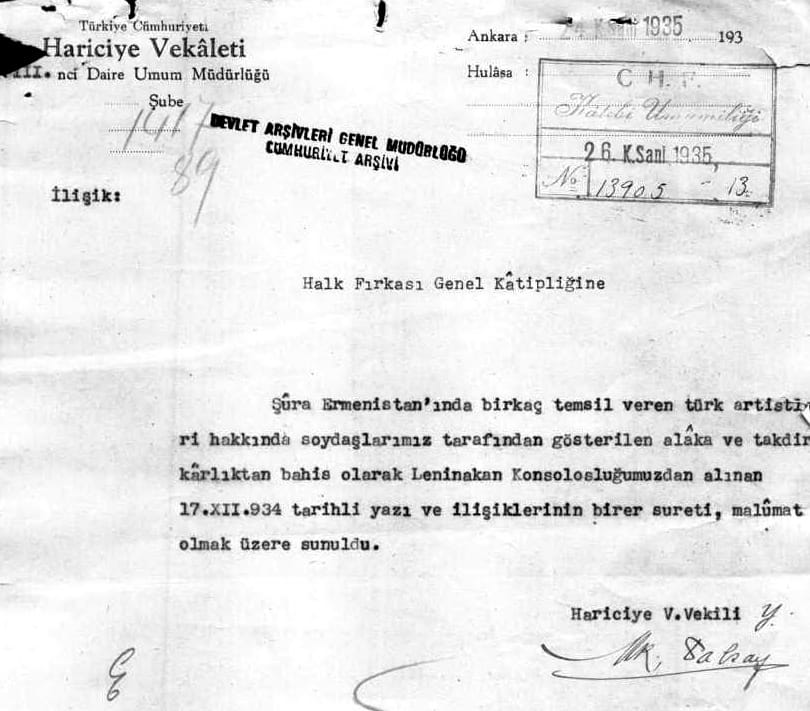 1934-cü ilin payızında Türkiyənin bir aktyor heyəti o zamanlar Şura Ermənistanı adlanan Qərbi Azərbaycan torpaqlarında konsert proqramı ilə iştirak edib. Böyük anşlaqla keçən bu tamaşalara Qərbi Azərbaycanla yanaşı Gəncədən və digər yerlərdən gələn azərbaycanlılar da ciddi maraq göstəriblər. Türkiyə arxivlərində gizliliyi götürülən yeni sənədlərdən aydın olur ki, bu tamaşaya baxmaq üçün azərbaycanlılar böyük canfəşanlıq ediblər. Bu tamaşanın necə baş tutması barədə Türkiyənin Leninakan (Gümrü) konsulu Səlahəddin Nüsrət bəyin xariciyyə vəkalətinə (xarici işlər nazirliyinə) göndərdiyi gizli mahiyyətli sənəddə geniş məlumat mövcuddur.