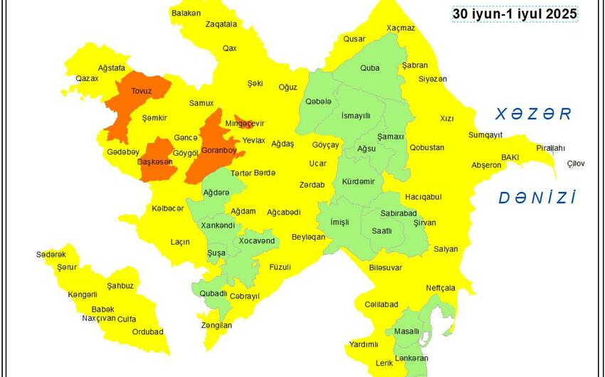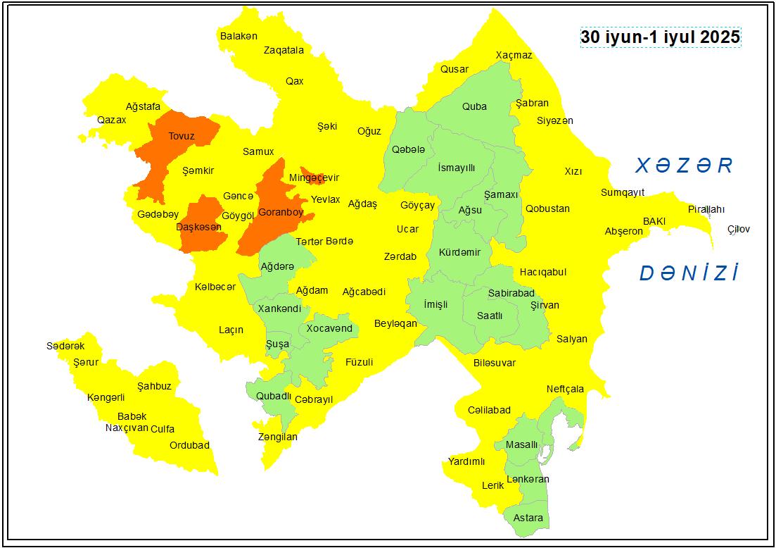 İyunun 30-u və iyulun 1-də Bakıda və Abşeron yarımadasında, eyni zamanda bəzi bölgələrdə gözlənilən küləkli hava şəraiti ilə bağlı sarı və narıncı xəbərdarlıq verilib.