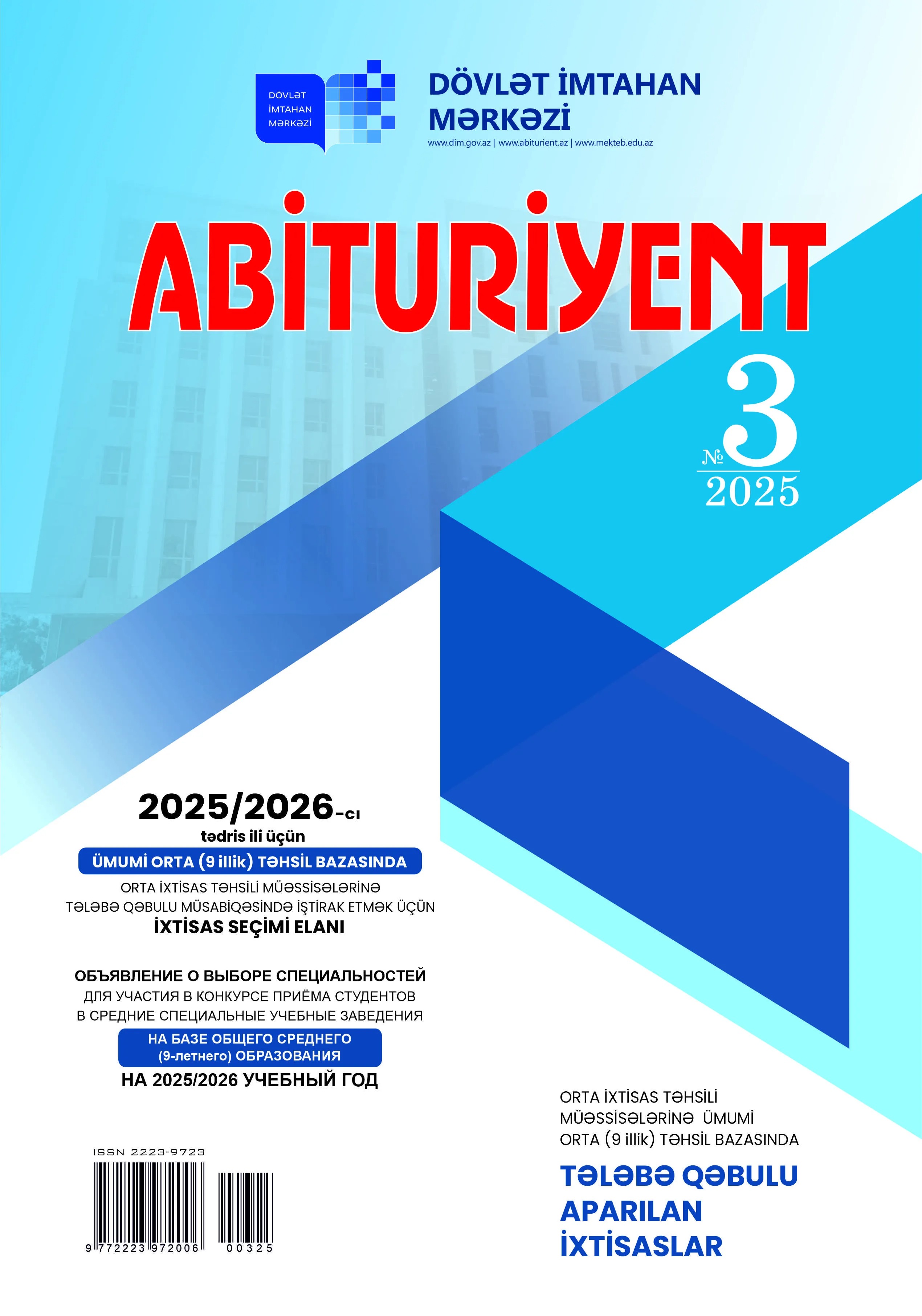 "Abituriyent" jurnalının 3-cü nömrəsində 2025/2026-cı tədris ili üçün Azərbaycan Respublikasının ümumi orta (9 illik) təhsil bazasında orta ixtisas təhsili müəssisələrinə tələbə qəbulu müsabiqəsində iştirak etmək üçün ixtisas seçimi elanı, qəbul aparılan ixtisaslar, onların plan yerləri, elektron ərizə verən abituriyent üçün təlimat, "Abituriyentin elektron ixtisas seçimi ərizəsi"nin nümunəsi və digər zəruri materiallar Azərbaycan və rus dillərində təqdim edilib.