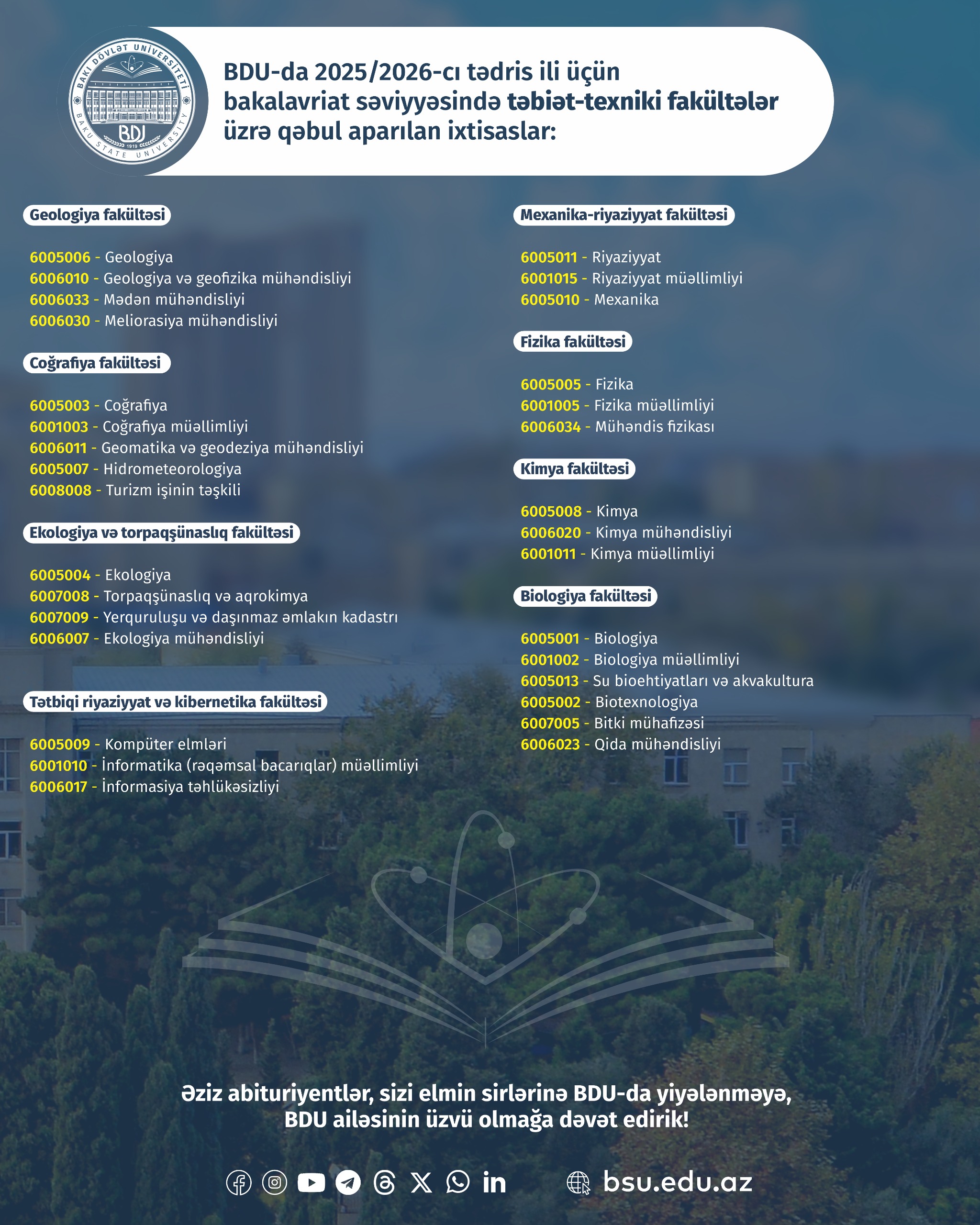 BDU-nun bakalavriat səviyyəsində 2025/2026-cı tədris ili üzrə “Xüsusi pedaqogika” ixtisası açılıb.