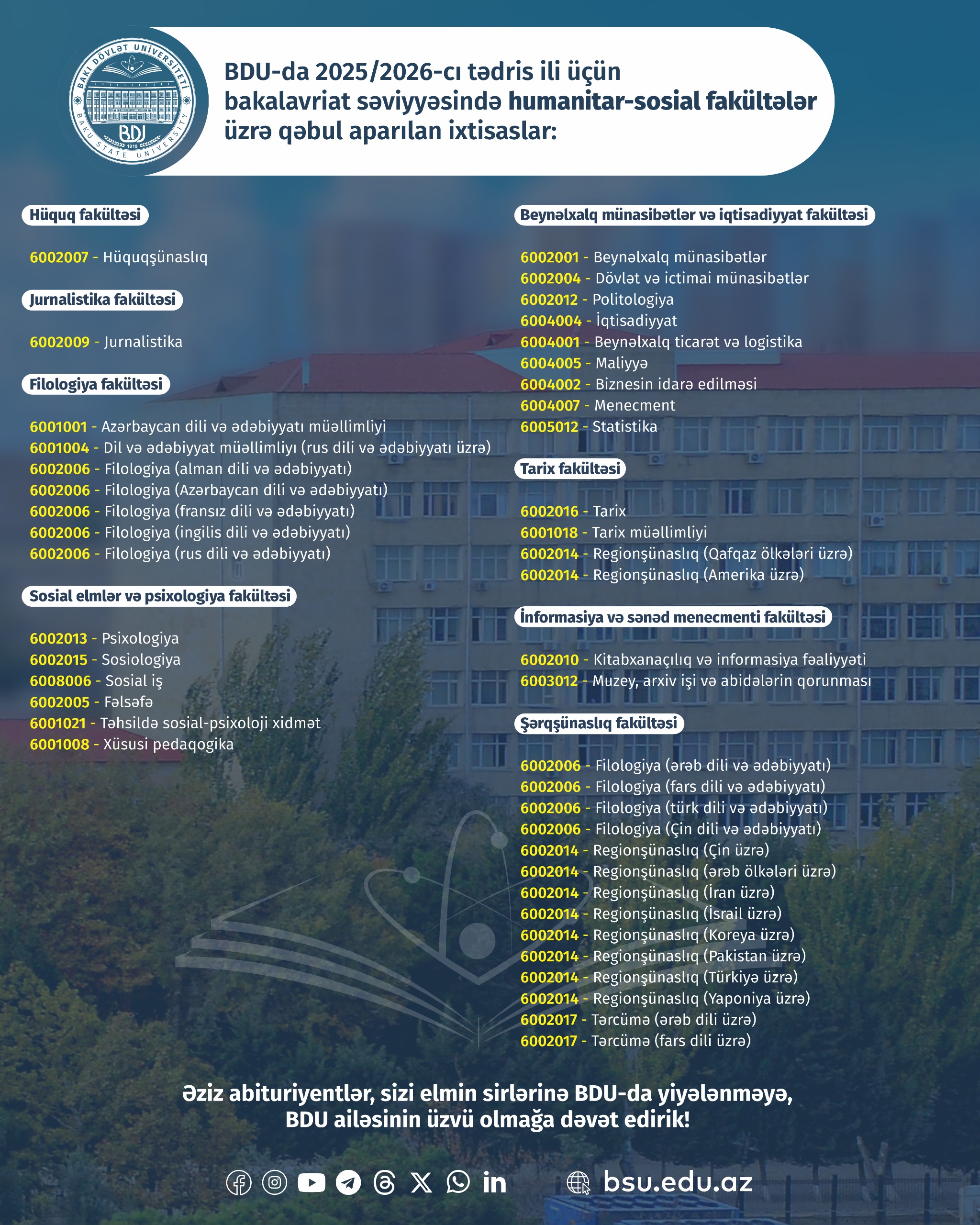 Bildirilib ki, ixtisas Sosial elmlər və psixologiya fakültəsində tədris olunacaq.