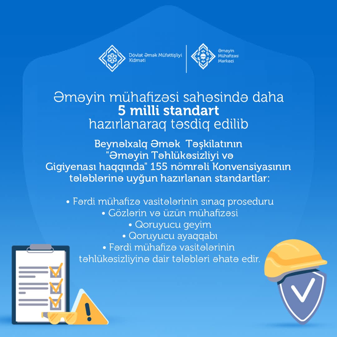 Bildirilib ki, Beynəlxalq Əmək Təşkilatının “Əməyin Təhlükəsizliyi və Gigiyenası haqqında” 155 nömrəli Konvensiyasının tələblərinə uyğun hazırlanan standartlar fərdi mühafizə vasitələrinin sınaq proseduru, gözlərin və üzün mühafizəsi, qoruyucu geyim, qoruyucu ayaqqabı və fərdi mühafizə vasitələrinin təhlükəsizliyinə dair tələbləri əhatə edir.