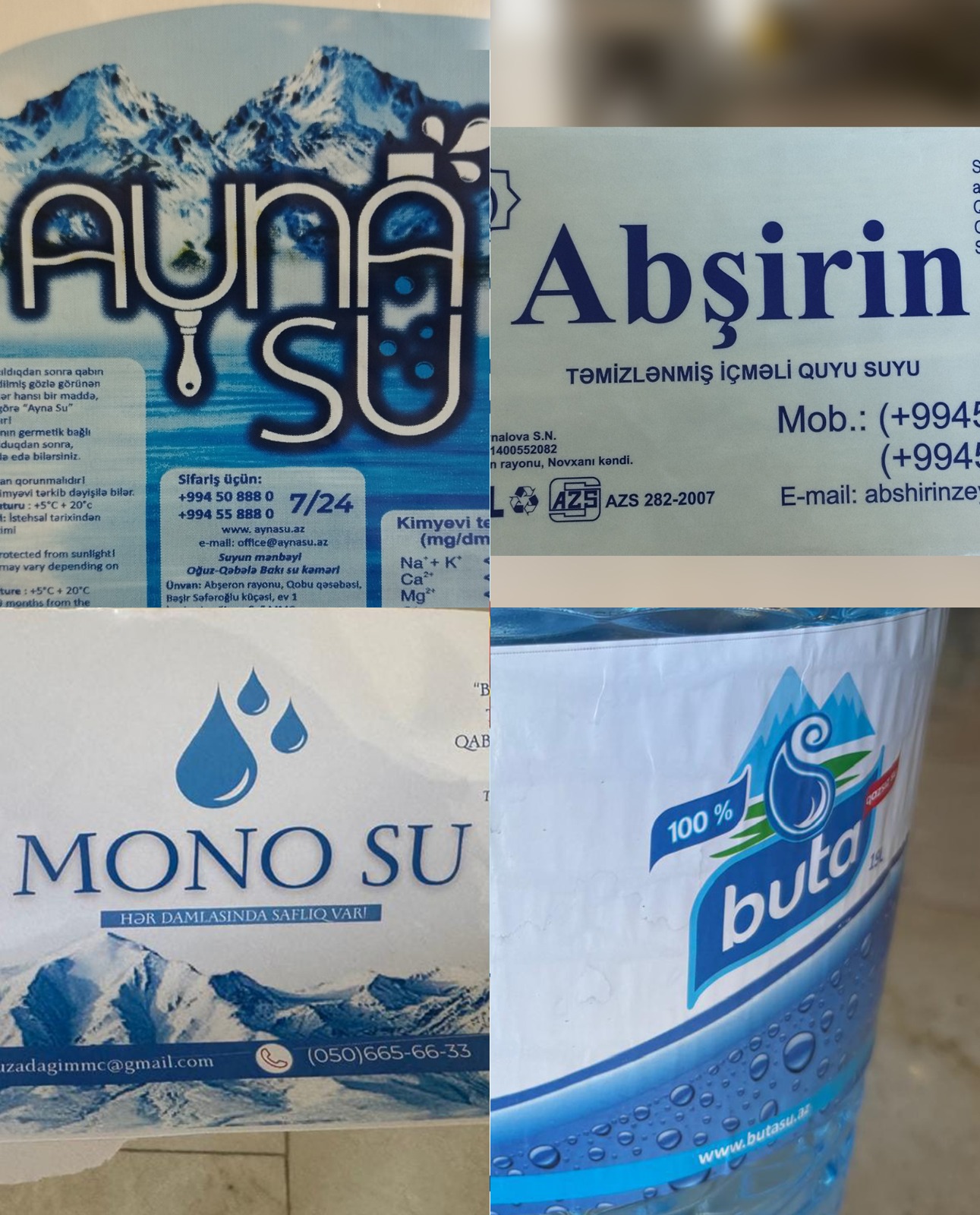 Uyğunsuzluq müəyyən edilmiş müəssisələr "Pak Su", İceberg", “Şeh Su”, "Saf Su", "Arı", "Duruca", "Venera", "İdeal", “Duru Su", "Aqua Flot", "Suel", "Mono Su", "Butasu A", "Abşirin", "Ayna Su", "Assu", "Abi Həyat" əmtəə nişanlı olublar. Uyğunsuzluq müəyyən edilmiş su aparat isə "Su Az" əmtəə nişanlı olub.