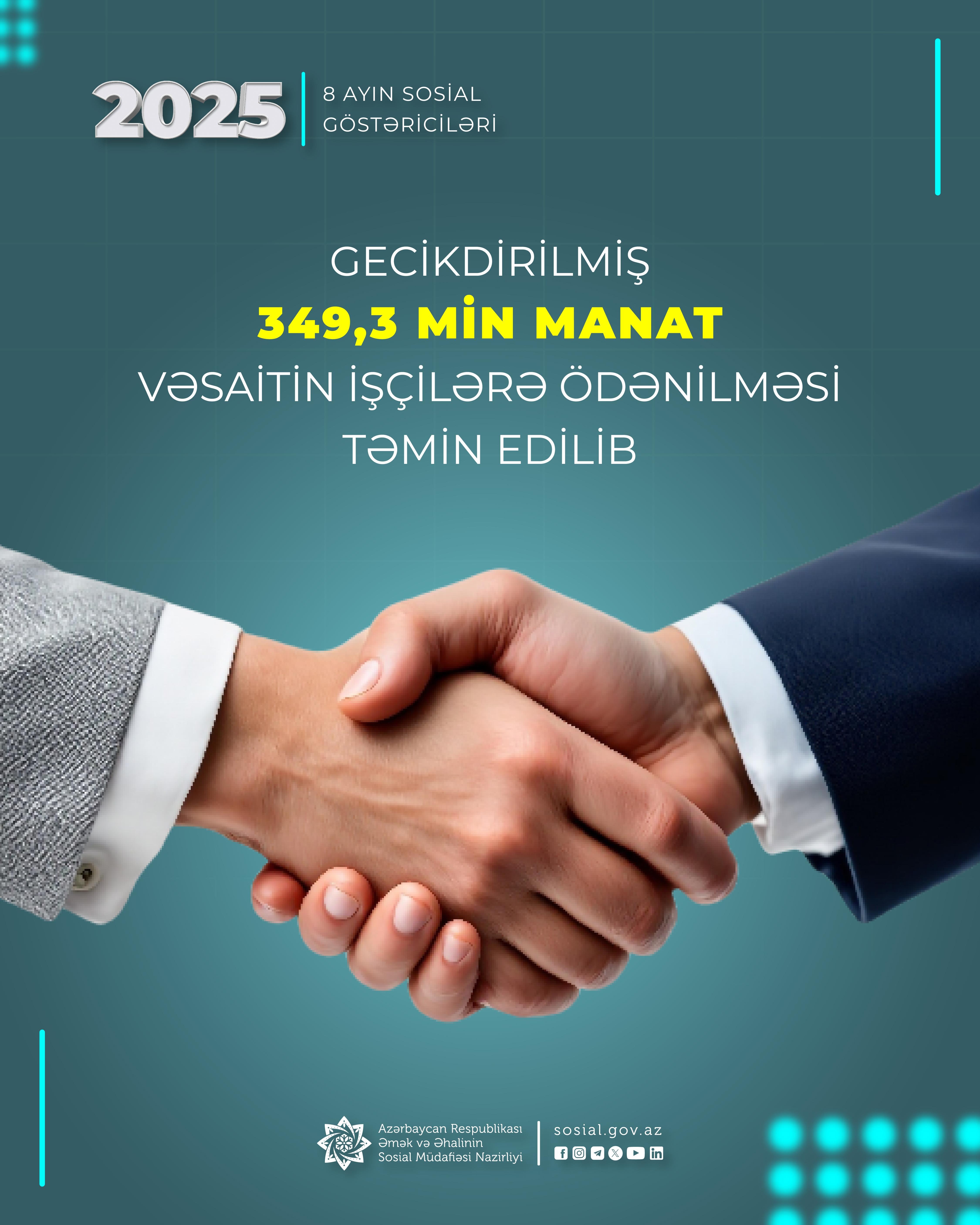 Bildirilib ki, Əmək və Əhalinin Sosial Müdafiəsi Nazirliyi yanında Dövlət Əmək Müfəttişliyi Xidməti yanvar-avqust ayları ərzində işəgötürənlər tərəfindən sosial xarakterli ödənişlər olan 349 334 manat vəsaitin işçilərə ödənilməsinin gecikdirildiyini müəyyən edib.