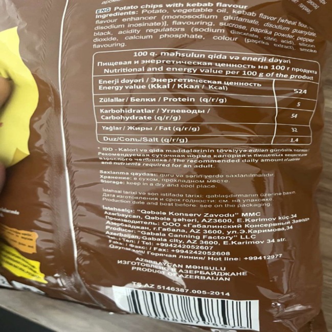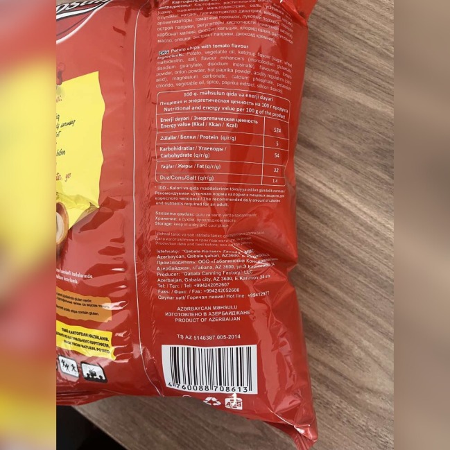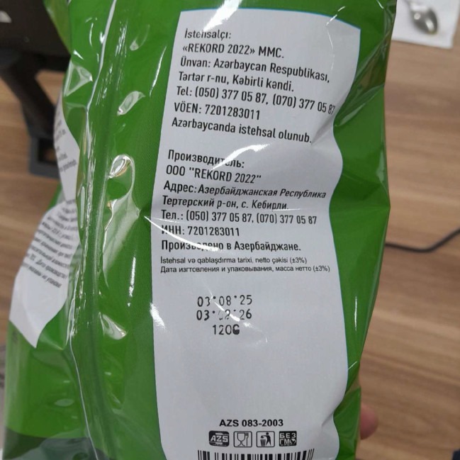 Bildirilib ki, sınaq nəticəsində “Rekord-2022” MMC-yə məxsus 1 nümunədə (“Rekord” əmtəə nişanlı 03.08.2025-03.02.2026 istehsal və son istifadə tarixli məhsul partiyası) və “Qəbələ Konserv Zavodu” MMC-yə məxsus 2 nümunədə (“Chipsim Kabab” əmtəə nişanlı 19.08.2025-19.04.2026 istehsal və son istifadə tarixli, “Chipsim Tomat” əmtəə nişanlı 07.08.2025-07.04.2026 istehsal və son istifadə tarixli məhsul partiyalarında) qida əlavəsinin normadan artıq olduğu müəyyən edilib. Aşkar edilmiş uyğunsuzluqla əlaqədar istehsalçı müəssisələrdə qanunvericiliyə uyğun zəruri tədbirlər görülərək, qeyd olunan istehsal tarixli məhsul partiyalarının ticarət şəbəkələrindən geri çağrılması və yığışdırılmasına dair müvafiq qərar qəbul olunub.