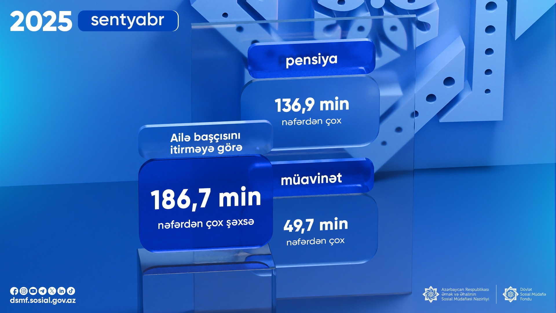 2025-ci ilin sentyabr ayında ailə başçısını itirməyə görə 186,7 min nəfərdən çox şəxsə pensiya və müavinət ödənilib.