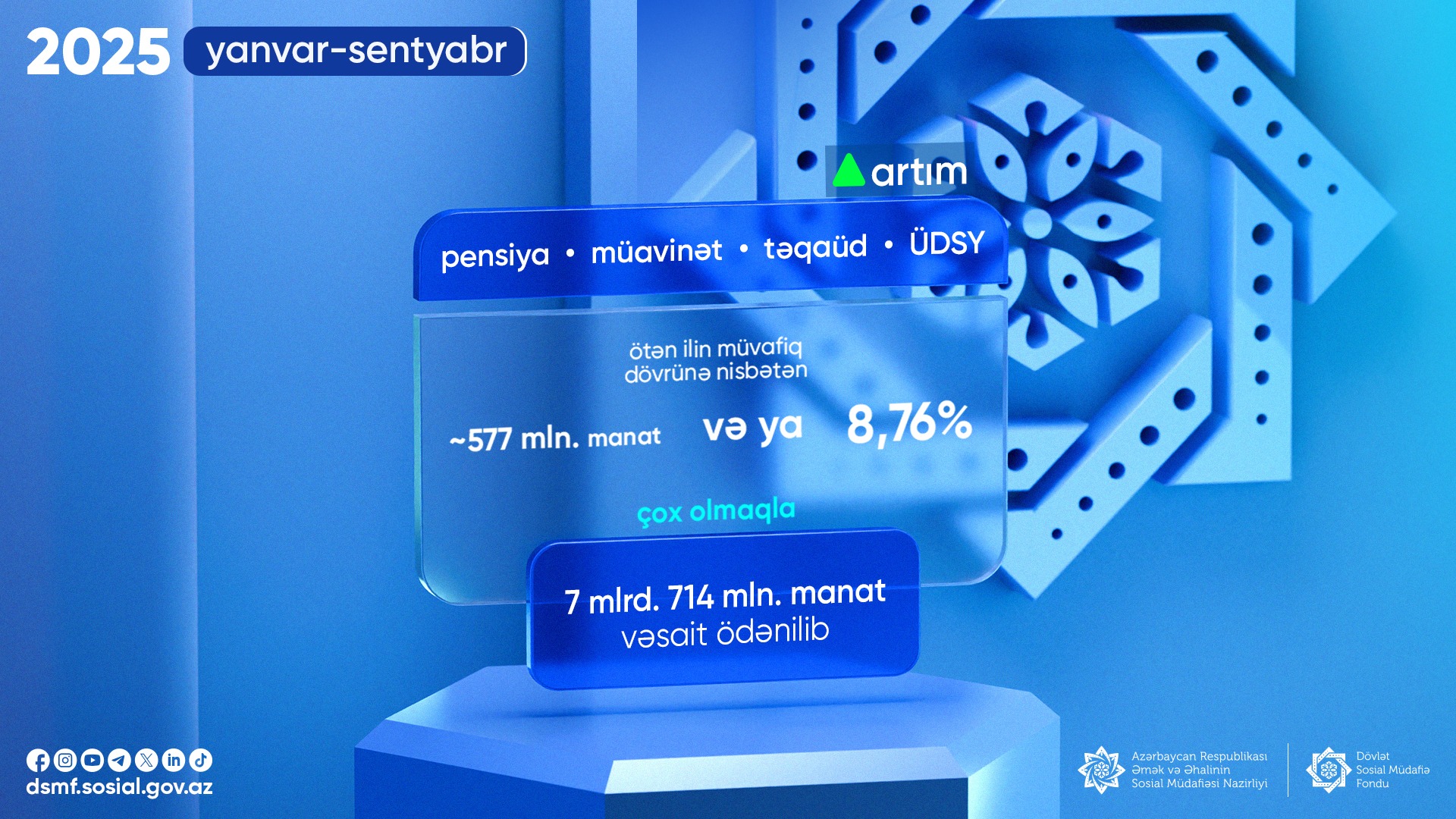 2025-ci ilin yanvar-sentyabr ayları ərzində pensiya, müavinət, təqaüd və ünvanlı dövlət sosial yardımları üzrə əhaliyə 7 mlrd. 714 mln. manat vəsait ödənilib.