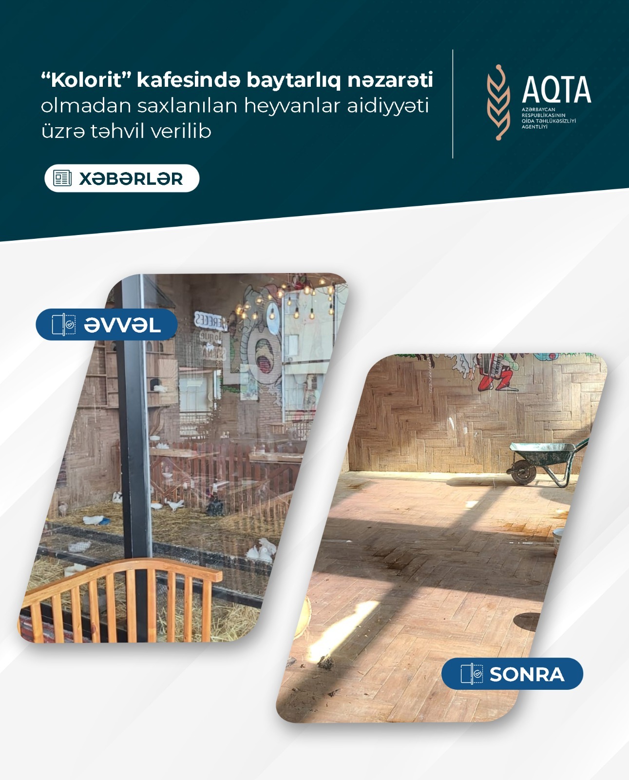 Aparılan monitorinqlər zamanı Bakı şəhəri, Xətai rayonu, M.Hadi küçəsi, ev 2094 ünvanında fəaliyyət göstərən “Kolorit” kafesində müəyyən edilmiş baytarlıq nəzarəti olmadan saxlanılan heyvan və quşlar (5 baş göyərçin, 15 baş dovşan, 2 baş xoruz, 4 baş tısbağa) aidiyyəti üzrə təhvil verilib.