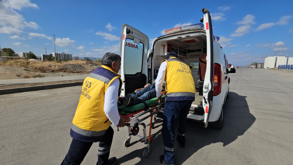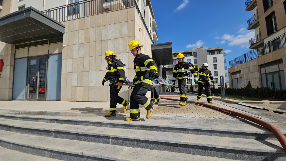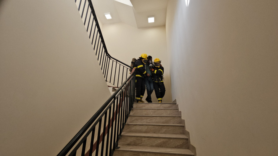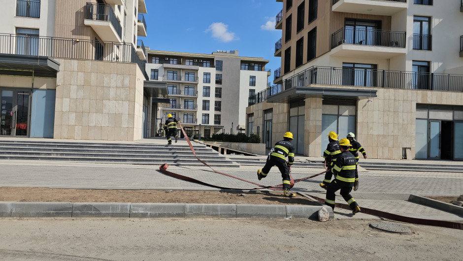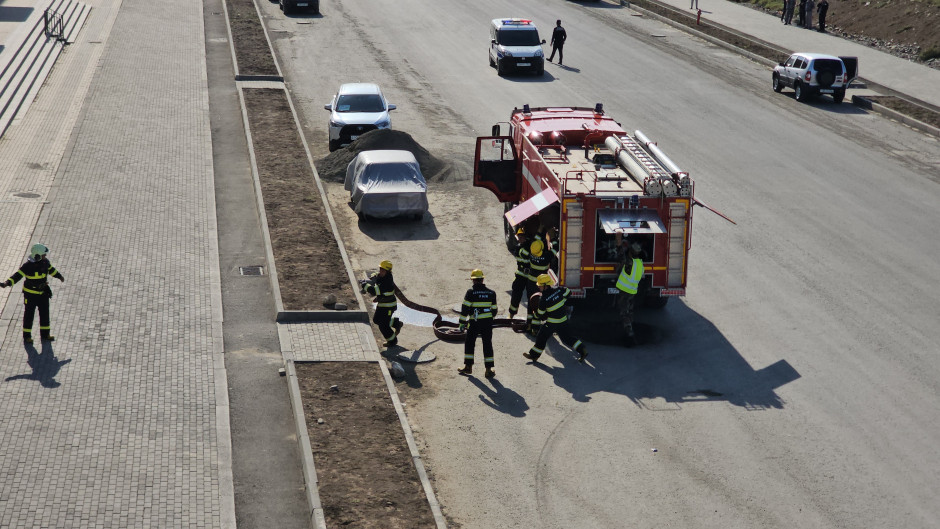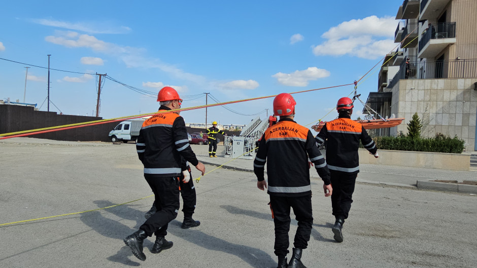 Sonra təlimin praktiki hissəsinə start verilib. Belə ki, şərti yanğın zamanı “Həyəcan” siqnalı verildikdən sonra FHN-in yanğın-xilasetmə bölmələri operativ qaydada hadisə yerinə çataraq kompleksin müvafiq personalı ilə əlaqəli şəkildə obyektin təxliyə planına uyğun insanların təhlükəsiz yerə təxliyəsini həyata keçirib, paralel olaraq “yanğınla mübarizə” tədbirləri yerinə yetirilib və şərti xəsarət almış şəxslərə “ilkin yardım göstərilib”.