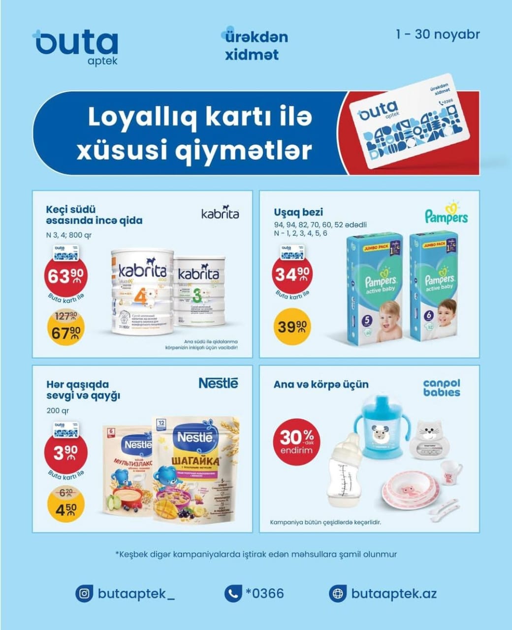 “Buta” Apteklər Şəbəkəsi müştərilərə 1-30 noyabr tarixlərində loyallıq kartı ilə bəzi məhsulları xüsusi endirimlə təklif edir. Lakin 1 və 2 noyabr tarixlərində həmin loyallıq kartı ilə endirimlərdən yararlanmaq mümkün olmayıb.