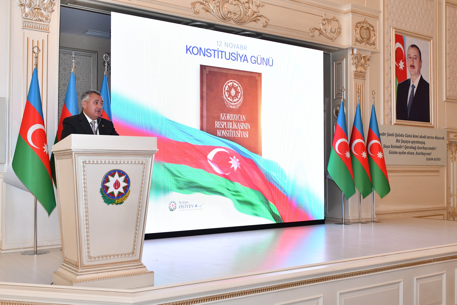 Tədbirdə iştirakçıları Konstitusiya Günü münasibəti ilə təbrik edən Abşeron RİH-in başçısı Abdin Fərzəliyev ölkəmizdə konstitusiyanın yaranmasından, Ümummilli Lider Heydər Əliyevin əvəzolunmaz xidmətlərindən və konstitusiyada olan maddələrin yerinə yetirilməsi istiqamətində dövlətimiz tərəfindən görülən işlər barədə çıxış edib. O bildirb ki, 1978-ci il aprelin 2-də Ulu Öndər Heydər Əliyevin təklifi ilə o dövrdə yeni Konstitusiyanın 73-cü maddəsində “Azərbaycan Sovet Sosialist Respublikasının dövlət dili Azərbaycan dilidir” kimi redaksiyada verilib. Ulu Öndər Heydər Əliyev bu tarixi əhəmiyyətli fəaliyyəti ilə dilimizin keşiyində durmuş, bu maddəni dövlətin əsas qanunu olan Konstitusiyaya salmaqla xalqımızın gələcək taleyini təmin etmişdir.
