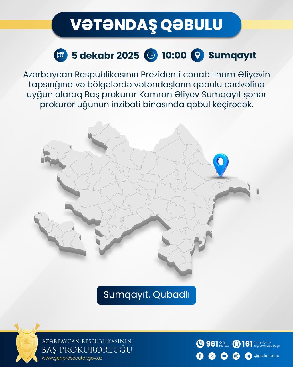 Azərbaycan Prezidenti cənab İlham Əliyevin tapşırığına və bölgələrdə vətəndaşların qəbulu cədvəlinə uyğun olaraq Baş prokuror Kamran Əliyev cari il dekabrın 5-də, saat 10:00-da Sumqayıt şəhər prokurorluğunun inzibati binasında Sumqayıt şəhər və Qubadlı rayon sakinlərinin qəbulunu keçirəcək.