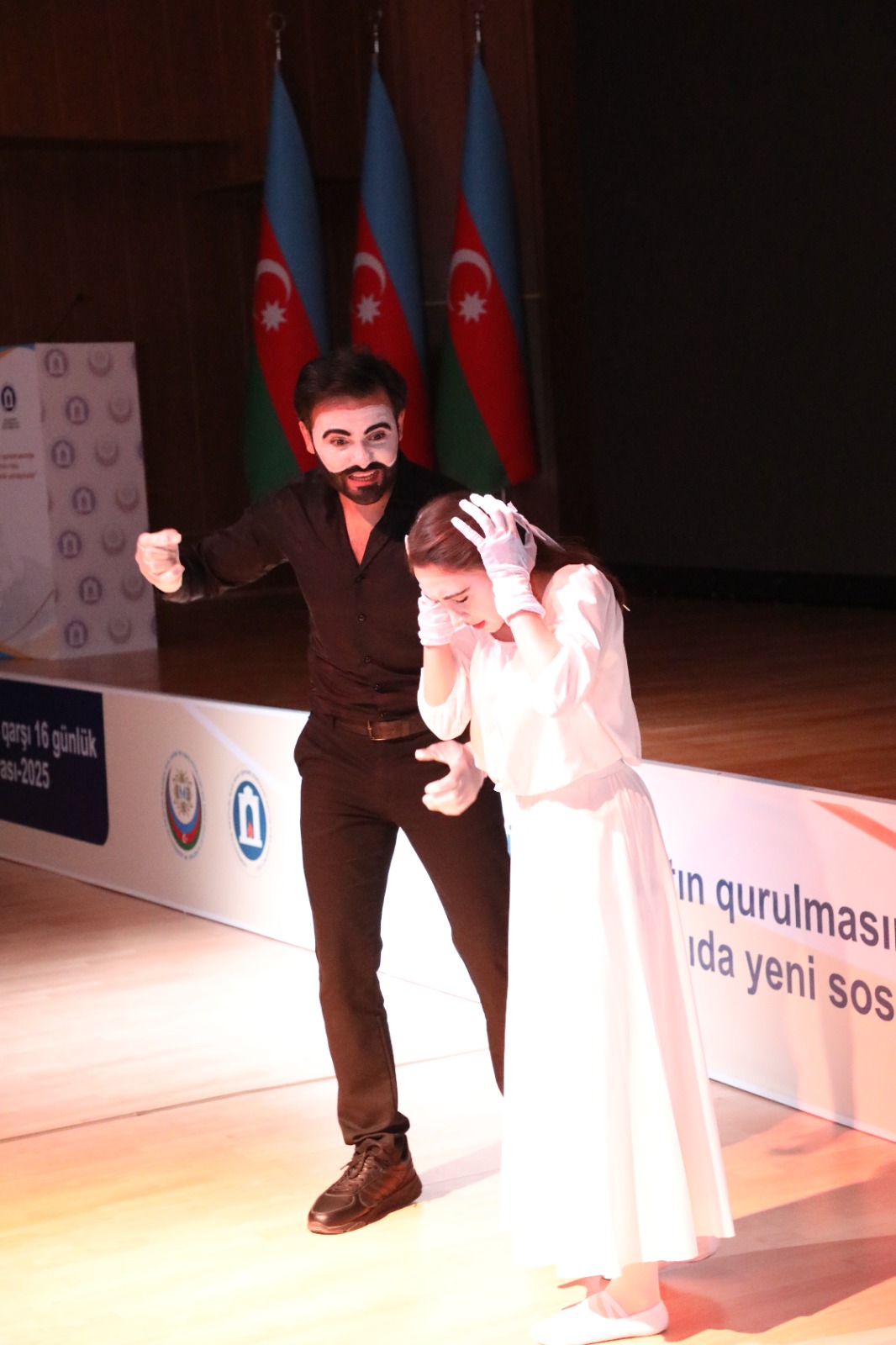 Öncə “Şiddətə qarşı sülhün səsi” adlı pantomim tamaşa nümayiş olunub. Daha sonra mövzuya həsr olunmuş video-çarx təqdim edilib.